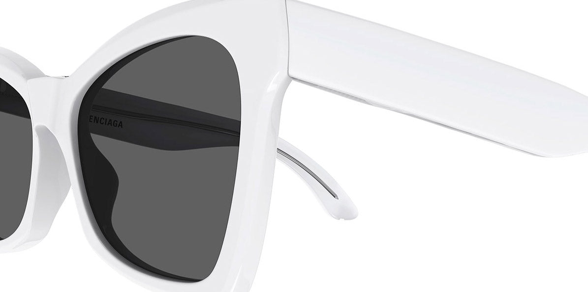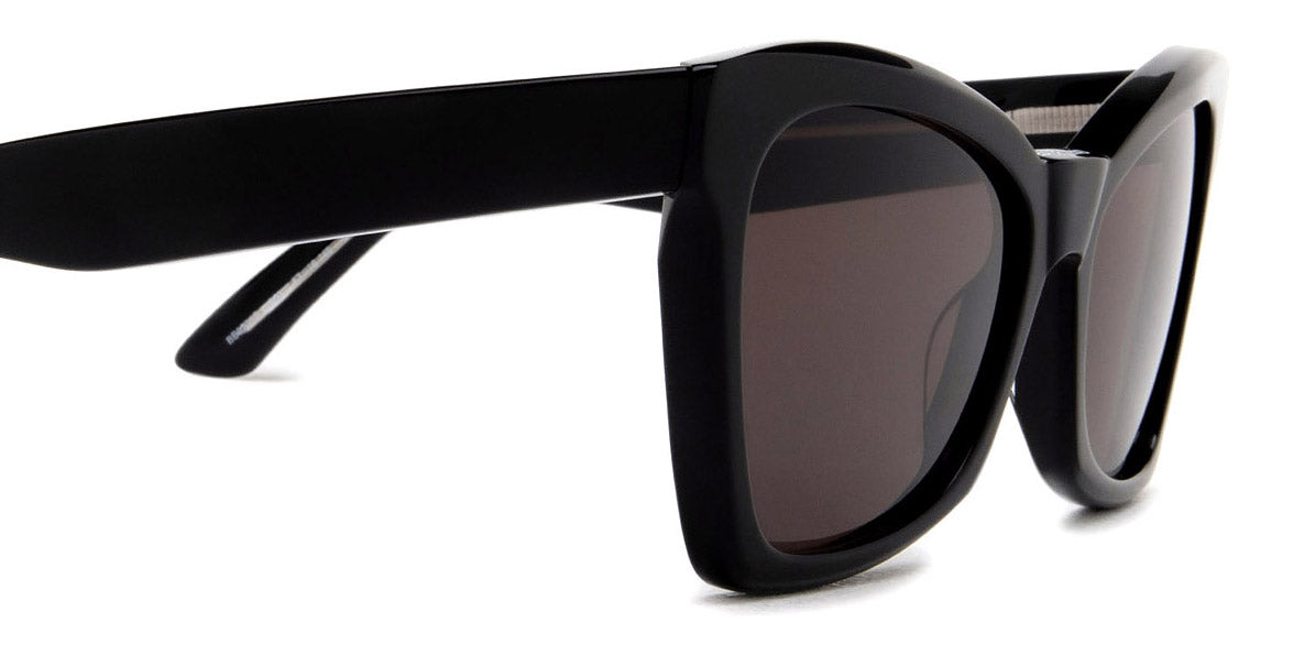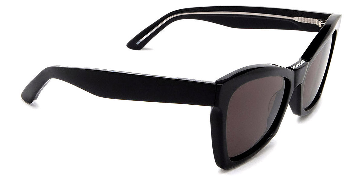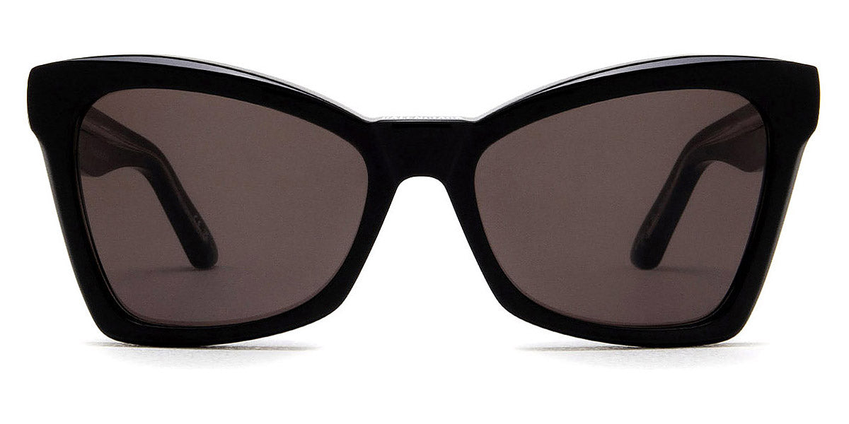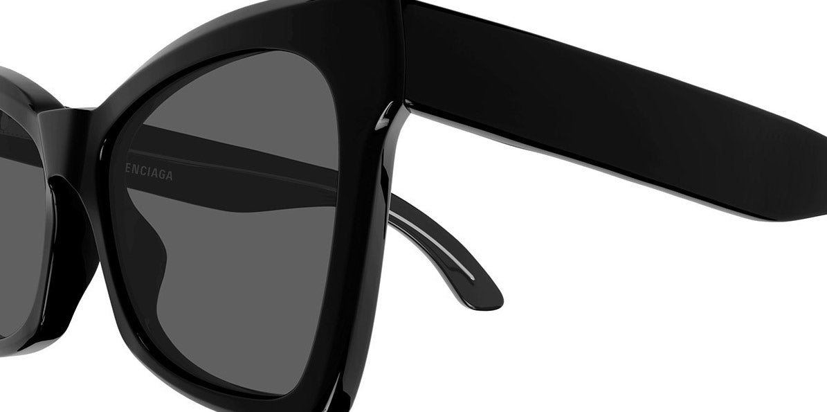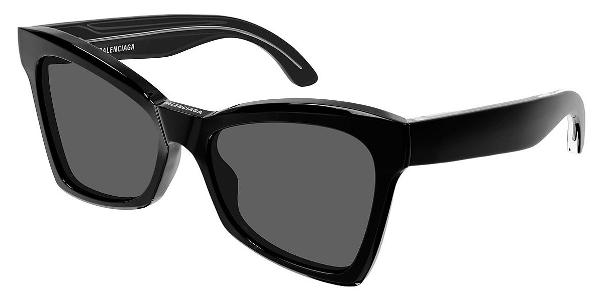 BB0231S Sunglasses by Balenciaga. Shape: Cat-Eye, Material: Acetate, Color: Black, Size: 57-18-145. The Balenciaga Eyewear collections consist of sunglasses and eyeglasses frames that combine a simple new style with the fashion house's desire to be inspired by technological innovation in its shapes and silhouettes. They embody revolutionary trends and fashionable realism. All models of glasses are marked with the brand's corporate logo, interpreted in their own way in different styles. The black double monogram "B" is set on transparent nose pads, creating a floating and weightless effect. The logo of the brand's sunglasses is applied to the mirror coating, which in different variations is always presented on the left temple. Extraordinary designs and unconventional materials mixed with more classic ones make Balenciaga eyewear unique and easily recognizable.