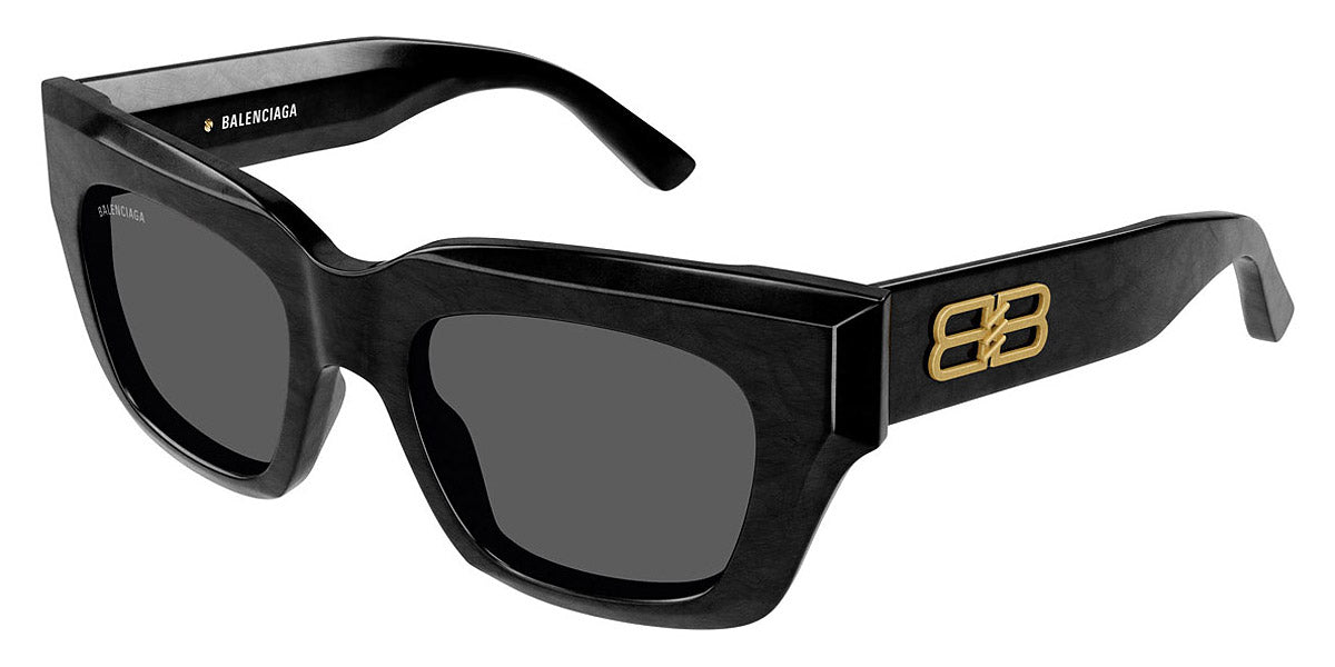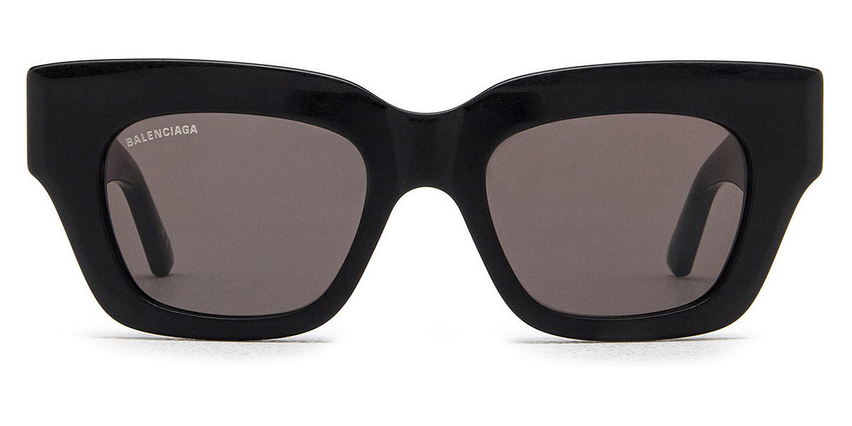 BB0234S Sunglasses by Balenciaga. Shape: Square, Material: Acetate, Color: Black, Size: 51-20-145. The Balenciaga Eyewear collections consist of sunglasses and eyeglasses frames that combine a simple new style with the fashion house's desire to be inspired by technological innovation in its shapes and silhouettes. They embody revolutionary trends and fashionable realism. All models of glasses are marked with the brand's corporate logo, interpreted in their own way in different styles. The black double monogram "B" is set on transparent nose pads, creating a floating and weightless effect. The logo of the brand's sunglasses is applied to the mirror coating, which in different variations is always presented on the left temple. Extraordinary designs and unconventional materials mixed with more classic ones make Balenciaga eyewear unique and easily recognizable.