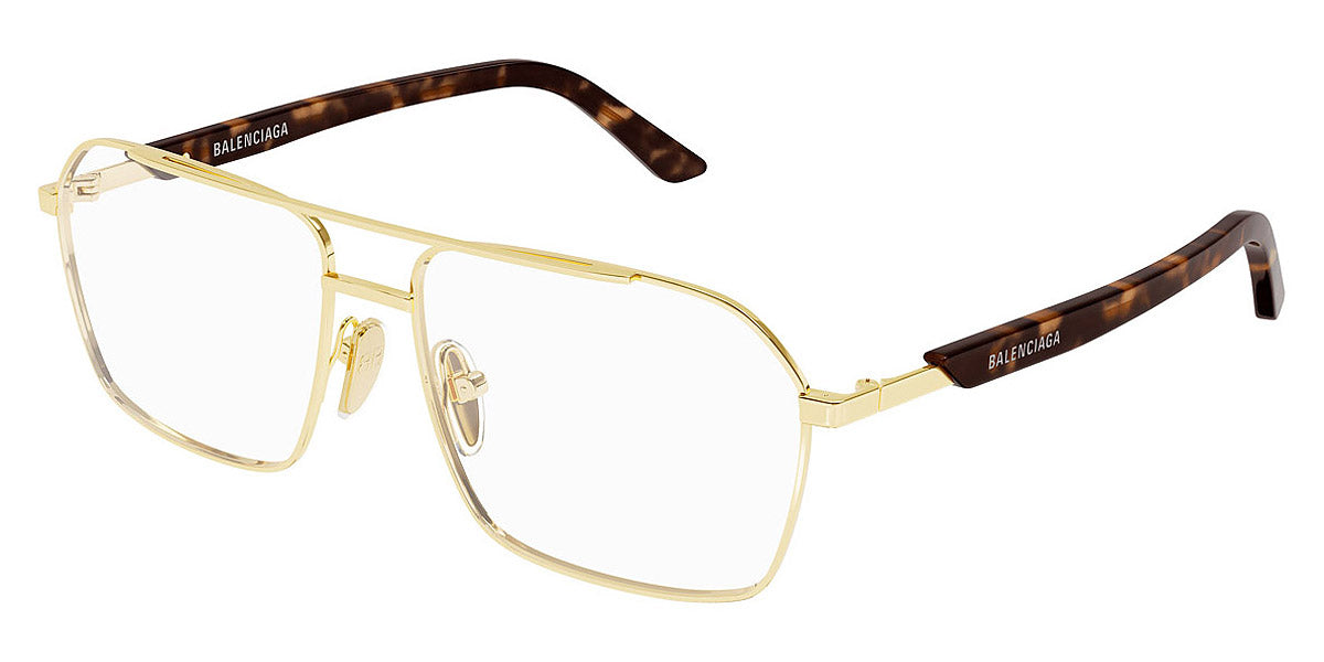 BB0248O Eyeglasses by Balenciaga. Shape: Aviator, Material: Metal, Color: Silver / Black, Size: 57-15-145. The Balenciaga Eyewear collections consist of sunglasses and eyeglasses frames that combine a simple new style with the fashion house's desire to be inspired by technological innovation in its shapes and silhouettes. They embody revolutionary trends and fashionable realism. All models of glasses are marked with the brand's corporate logo, interpreted in their own way in different styles. The black double monogram "B" is set on transparent nose pads, creating a floating and weightless effect. The logo of the brand's sunglasses is applied to the mirror coating, which in different variations is always presented on the left temple. Extraordinary designs and unconventional materials mixed with more classic ones make Balenciaga eyewear unique and easily recognizable.