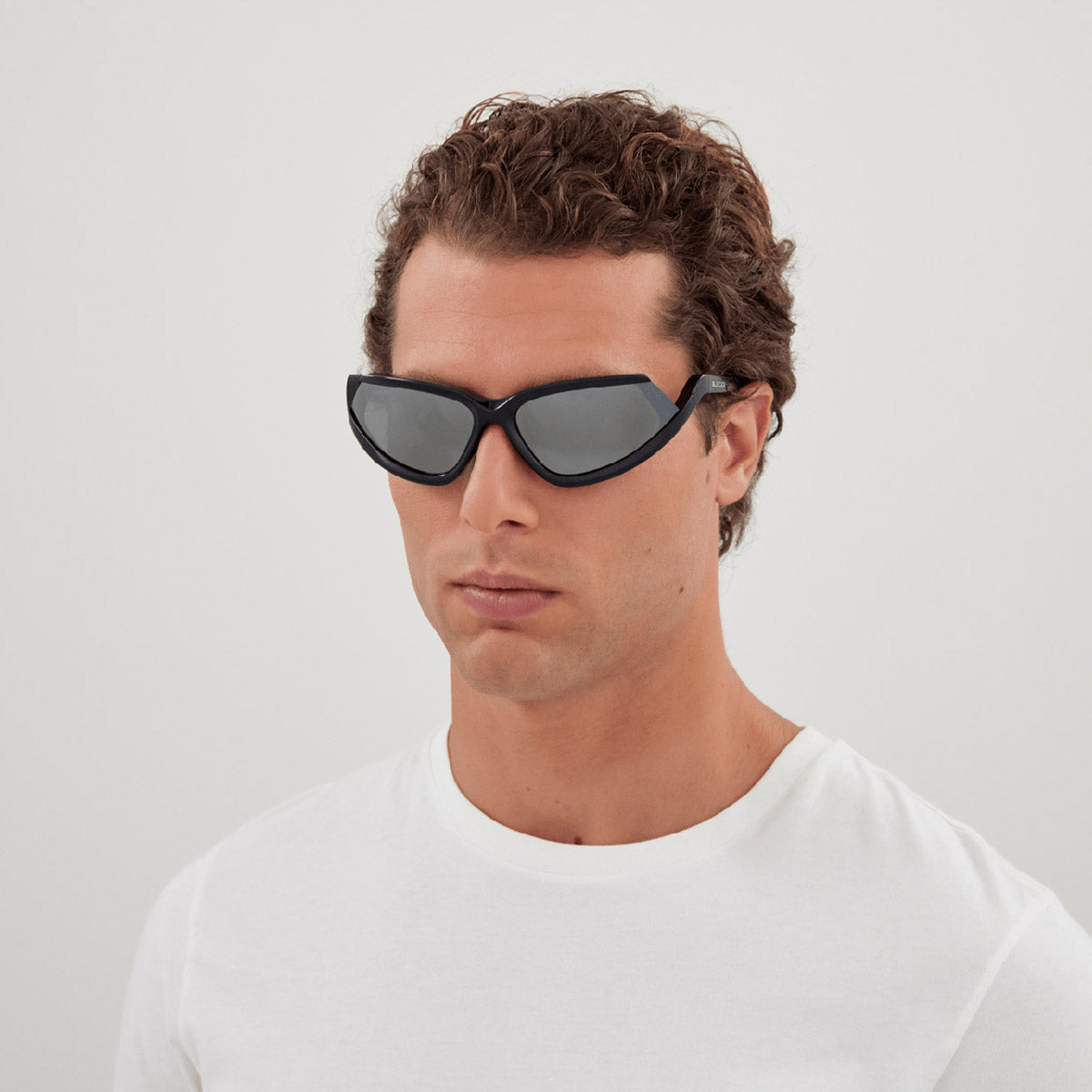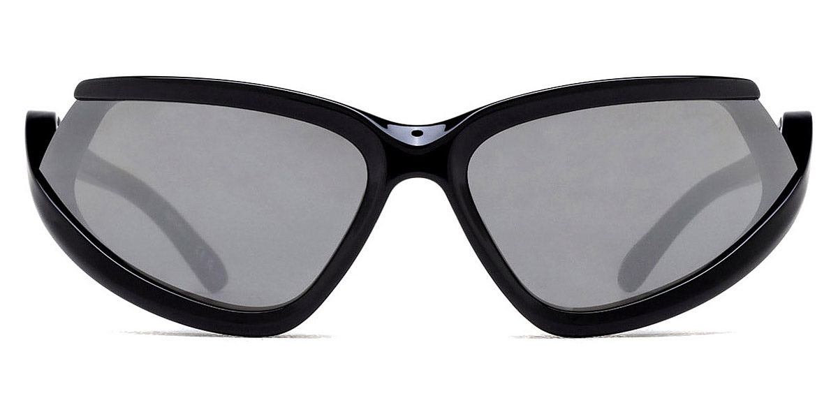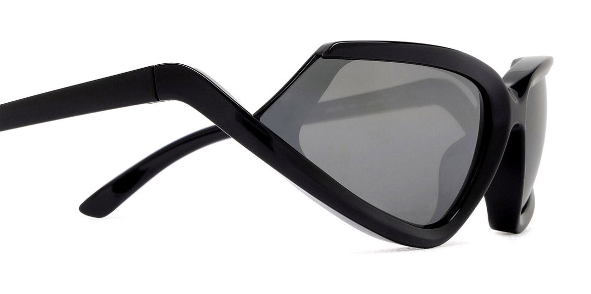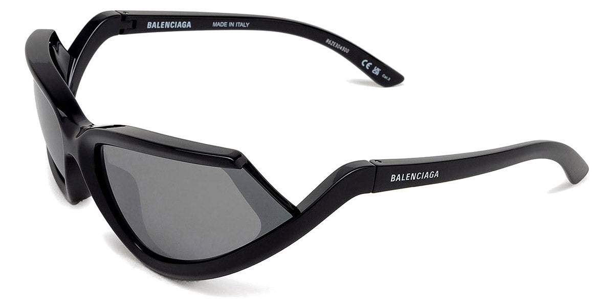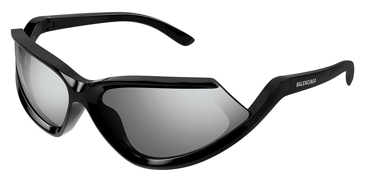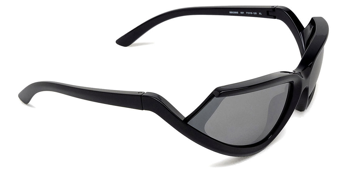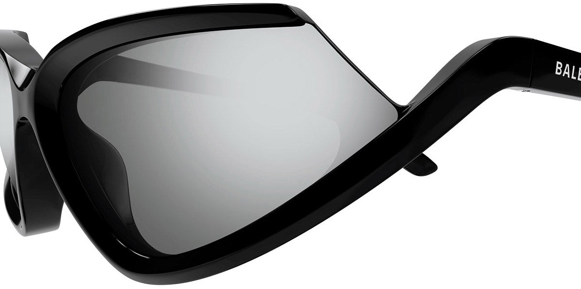 BB0289S Sunglasses by Balenciaga. Shape: Wrap, Material: Acetate, Color: Black, Size: 71-16-120. The Balenciaga Eyewear collections consist of sunglasses and eyeglasses frames that combine a simple new style with the fashion house's desire to be inspired by technological innovation in its shapes and silhouettes. They embody revolutionary trends and fashionable realism. All models of glasses are marked with the brand's corporate logo, interpreted in their own way in different styles. The black double monogram "B" is set on transparent nose pads, creating a floating and weightless effect. The logo of the brand's sunglasses is applied to the mirror coating, which in different variations is always presented on the left temple. Extraordinary designs and unconventional materials mixed with more classic ones make Balenciaga eyewear unique and easily recognizable.