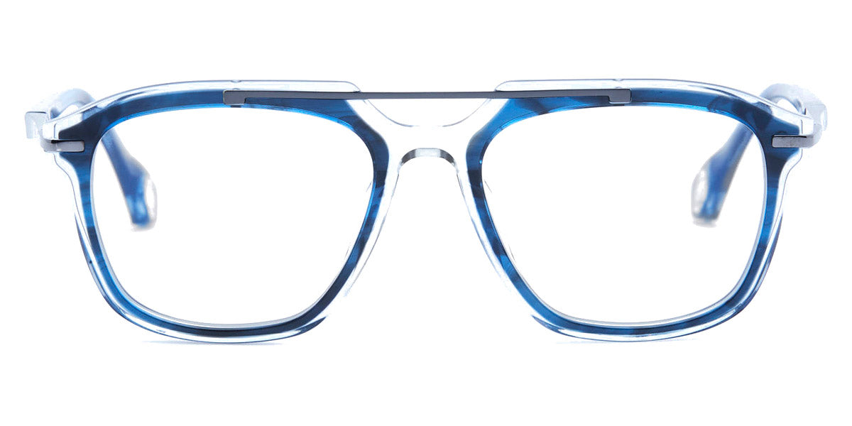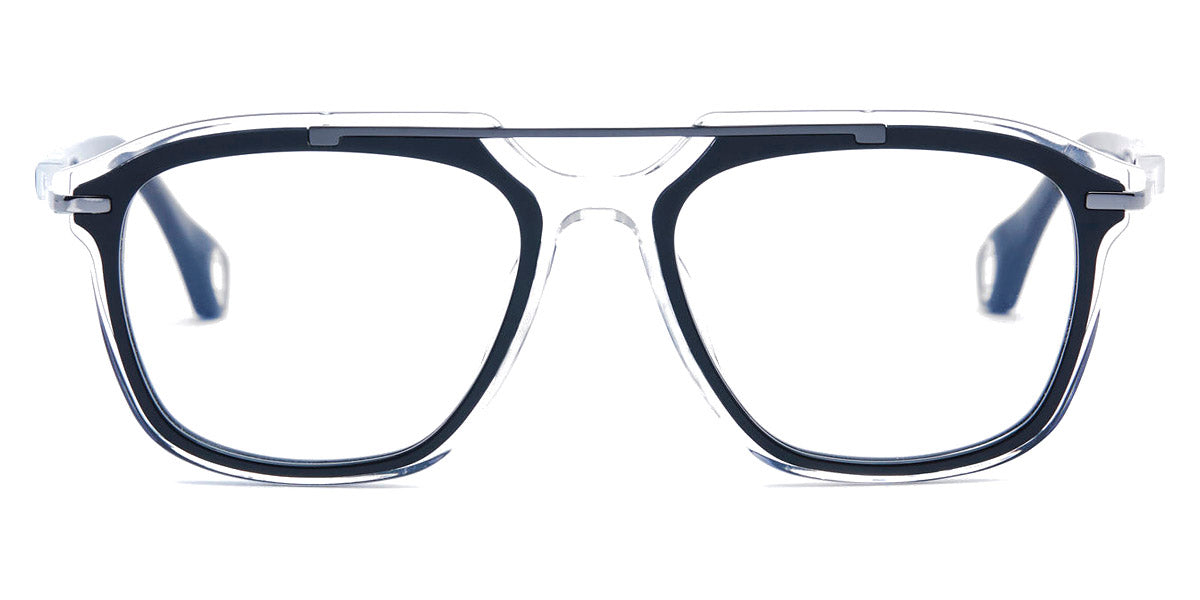 DELANO Eyeglasses by Blake Kuwahara. Color: Blue Horn, Midnight, Size: 53-19-145. With a sleek aviator shape and a bold frame-within-a-frame concept, the DELANO eyeglasses exude confidence and flair. Creating a striking contrast between the rich hues of the inner rims and the translucent, lucid acetate that surrounds them, they add a touch of modernity to the iconic pilot silhouette. Perfect for those who appreciate both tradition and innovation, the DELANO is all style while providing durability and comfort.