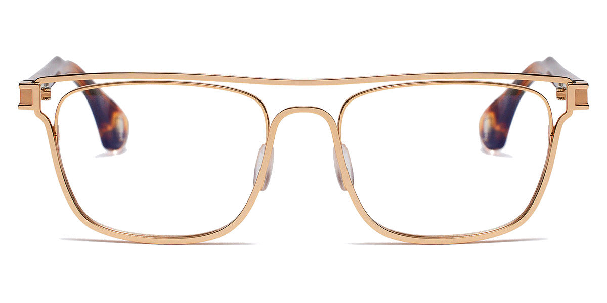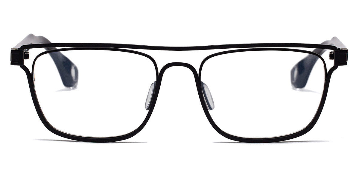 VOLK Eyeglasses by Blake Kuwahara. Color: Black Matte, Gold, Size: 55-19-145. Gracefully understated, the VOLK eyeglasses offer a delicate aviator design with a slim metal frame and finely contoured bridge. The sleek, minimalist construction exudes quiet elegance, perfect for those who appreciate subtlety. Though lightweight, they offer durability that lasts through daily wear. Crafted for enduring comfort and exquisite style, the VOLK is sure to add a soft modern edge to any wardrobe.