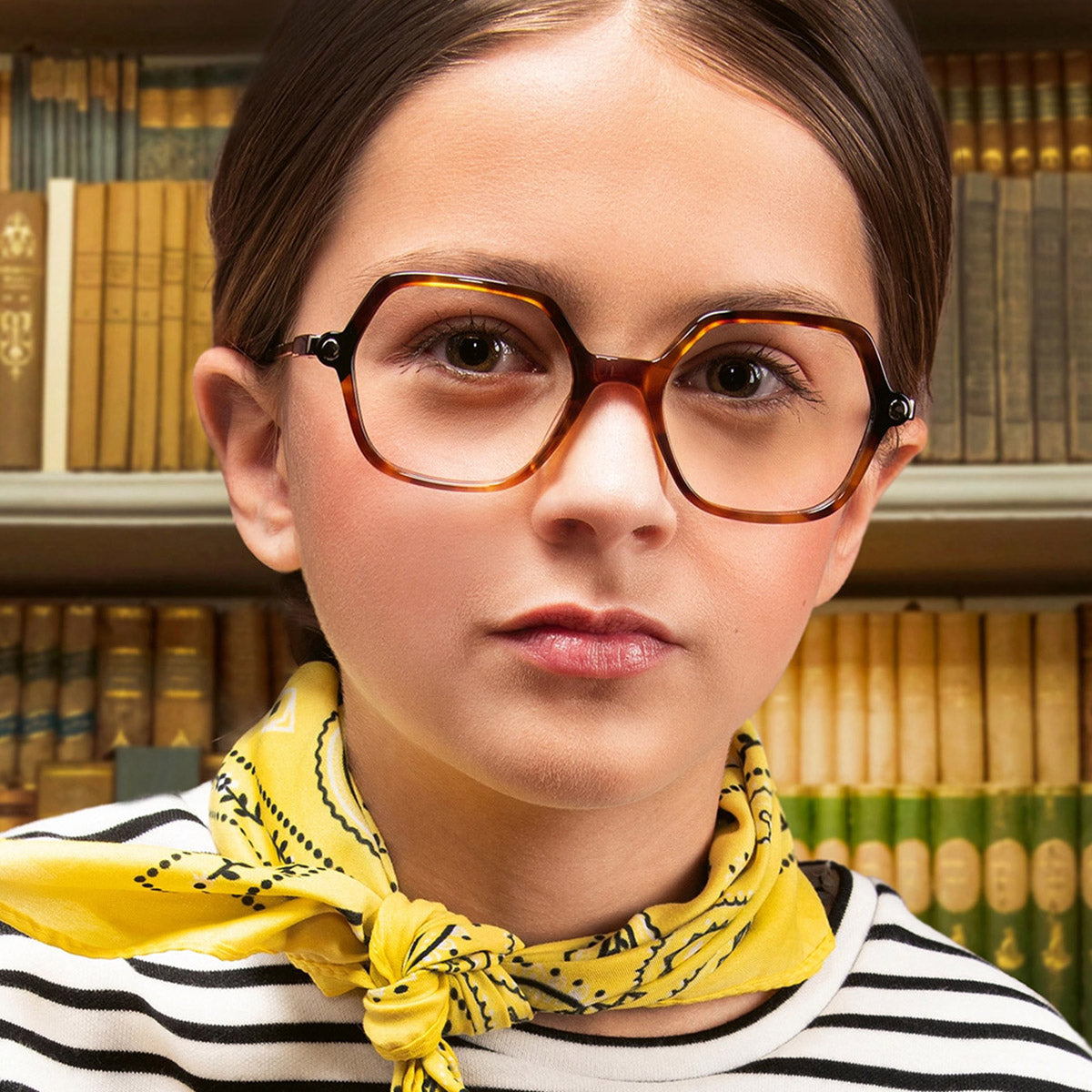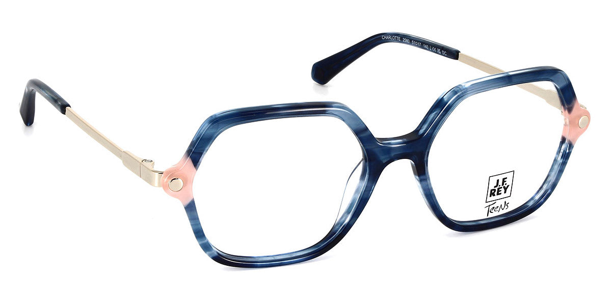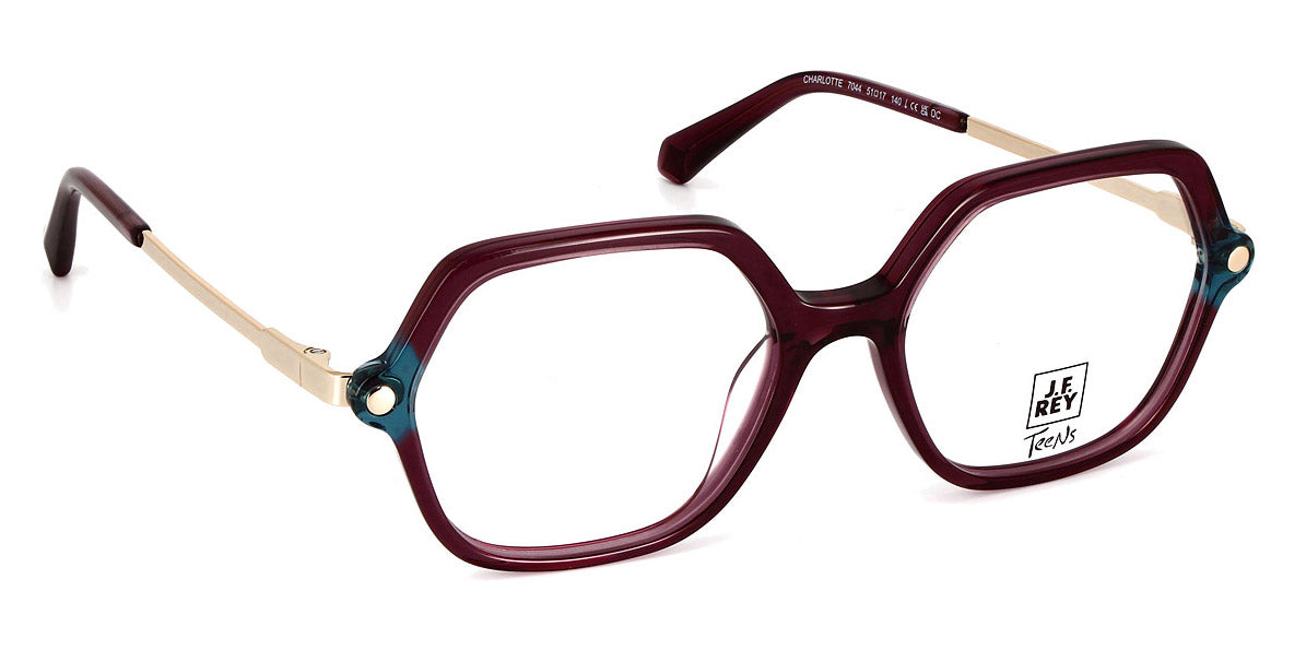 Charlotte Kids Eyeglasses by J.F. Rey. Color: 2580 Blue/Pink, 3020 Red/Blue, 4092 Green/Brown, 7044 Purple/Blue, 7595 Lavander/Brown, 9000 Demi/Black, Size: 51-17-140.