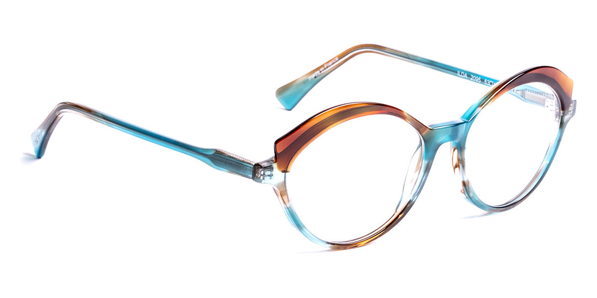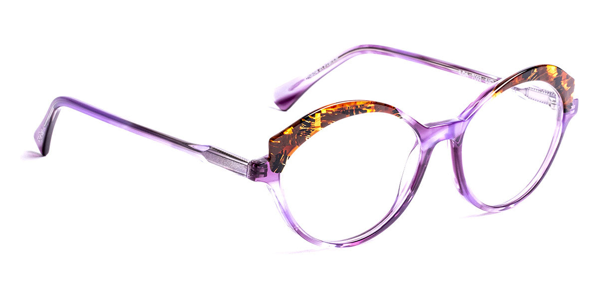 Ilda Eyeglasses by J.F. Rey. Color: 2095 Blue Brown/Dark Demi, 7092 Purple/Brown Amber, Size: 53-17-135. The Ilda casual eyeglasses designed for women by J. F. Rey. These glasses showcase a charming cat-eye shape design, accentuated by a full-rim acetate frame. Available in two distinct color combinations and sizes, this model offers versatile choices. The acetate frame incorporates collages of acetate on its upper arches, introducing visual creativity to the forefront. These collages play with the original shape, blending colors and varying the density of materials for an engaging aesthetic. J. F. Rey, the French brand, masterfully combines seemingly opposing characteristics, resulting in an appearance of effortless flawlessness. Their eyeglasses seamlessly encompass elements of conservatism, boldness, and flashiness, all while retaining a sense of humility. While their appearance may seem simple, wearing J. F. Rey's frames requires a dash of charisma and inner strength, as the brand's uniqueness is unparalleled and irreplaceable. Only materials with a proven history of excellence are employed in the production of their eyeglasses, with steel and cellulose acetate emerging as the highest quality materials for crafting spectacle frames. The designers behind J. F. Rey models encapsulate the essence of modern young individuals who hold an appreciation for timeless classics.