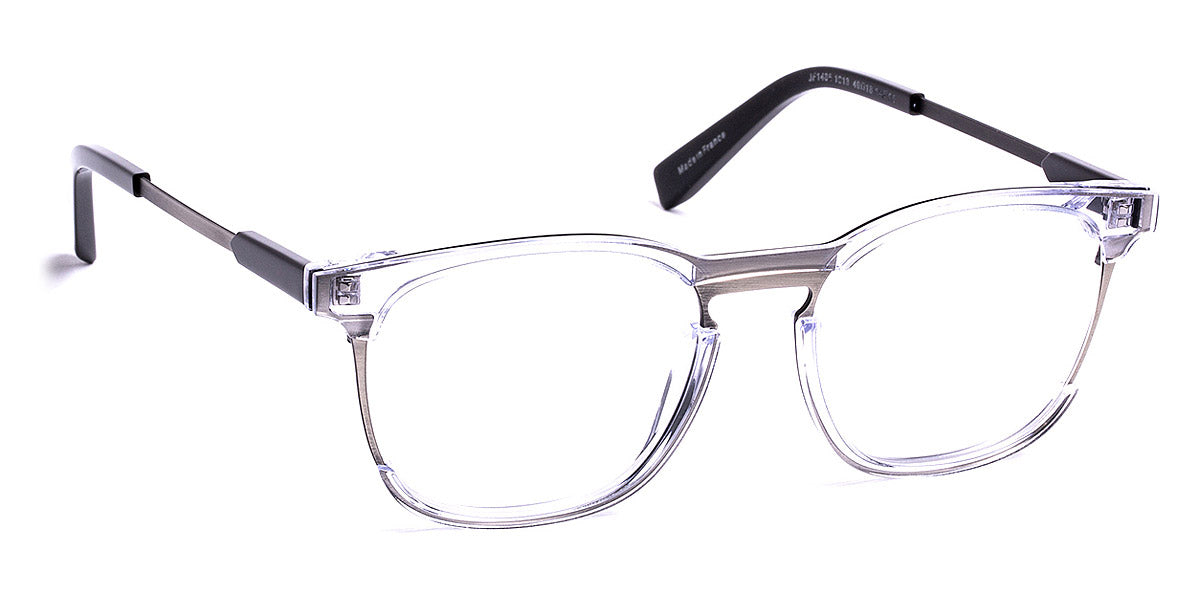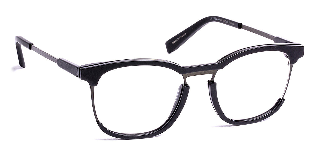 JF1465 Eyeglasses by J.F. Rey. Color: 0045 Matte Black/Khaki, 1013 Crystal/Black Temple/Brushed Silver, Size: 49-18-145. Presenting the JF1465 Eyeglasses by J. F. Rey™, a testament to visionary eyewear design and craftsmanship. These frames boast a captivating rectangular shape with a full-rim acetate frame, seamlessly blending classic elegance with modern elements. Available in two distinctive color combinations and sizes, these glasses cater to a variety of tastes and face shapes. The ultra-fine acetate frame combines exceptional lightness with remarkable strength.