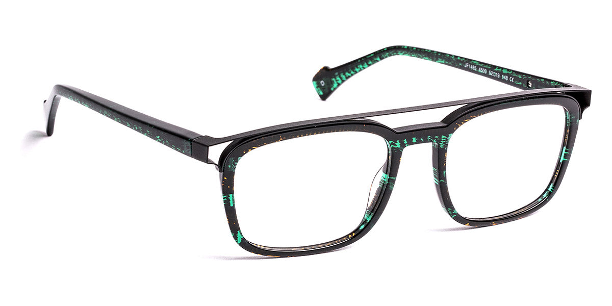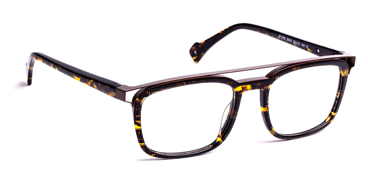 JF1485 Eyeglasses by J.F. Rey. Color: 1005 Crystal/Antic Silver, 4500 Tissue Green/Orange/Matte Black, 9545 Demi/Khaki, Size: 52-19-148. Crafted exclusively with time-tested materials, the JF1485 eyeglasses by J. F. Rey showcase a captivating oval shape with a full-rim acetate frame, effortlessly blending timeless style with modern elements. Offered in two distinct color combinations and sizes, these glasses cater to diverse preferences and face shapes. The ultra-fine acetate frame is remarkably lightweight yet exceptionally robust.