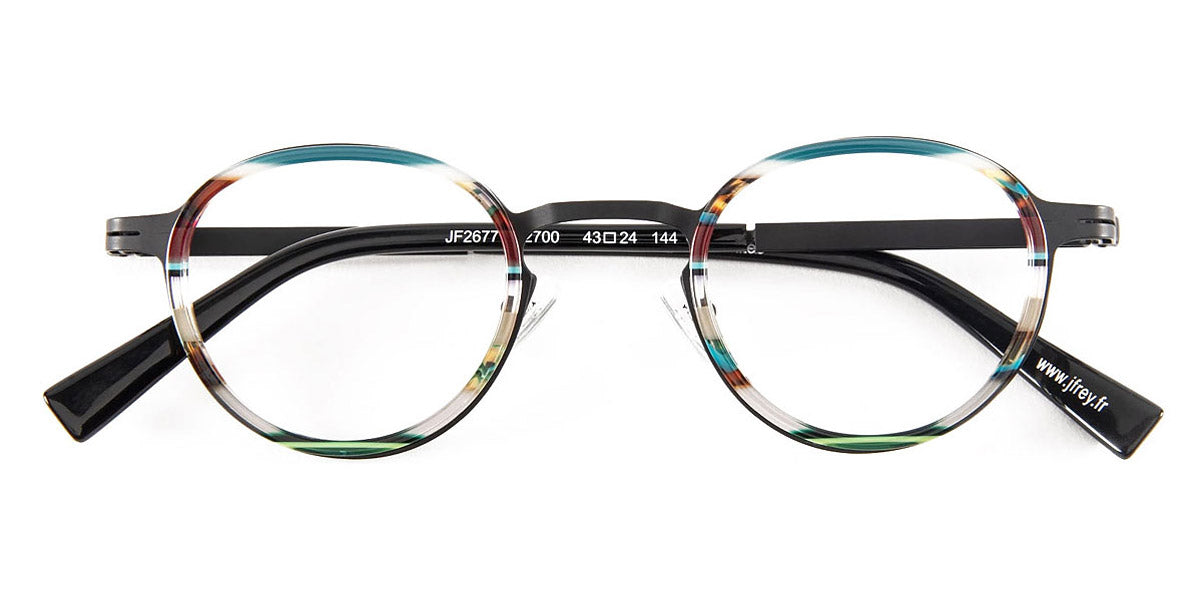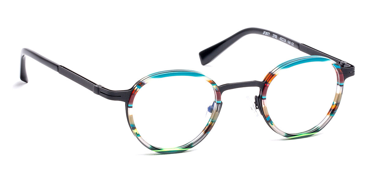 JF2677 Eyeglasses by J.F. Rey. Color: 0035 Stripes Black/Red, 0330 Matte Black/Red, 2005 Gradient Blue/Gunmetal, 2120 Demi Blue/Strong Blue, 2700 Stripes Blue/Black, 4500 Stripes Green/Black, 8505 Pink Horn/Antic Gray, 9040 Gradient Demi/Green, 9165 Stripes Brown/Blue/Copper, 9260 Demi/Copper, 9445 Demi/Green, 9520 Gradient Demi/Blue, Size: 43-24-144. Experience a fusion of modern design and artistic flair with JF2677 by J.F. Rey®. These eyeglasses showcase a unique frame that demands attention. The interplay of colors and materials adds depth and character to the overall aesthetic. Crafted from high-quality materials, these glasses offer both durability and comfort, making them an ideal choice for everyday wear. With JF2677, you're not just wearing glasses; you're making a bold style statement.