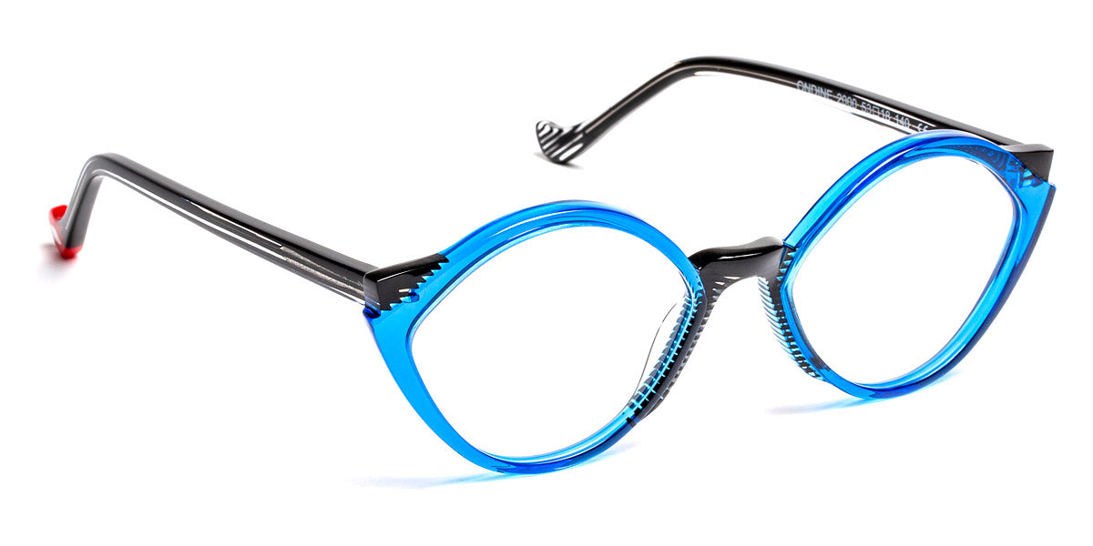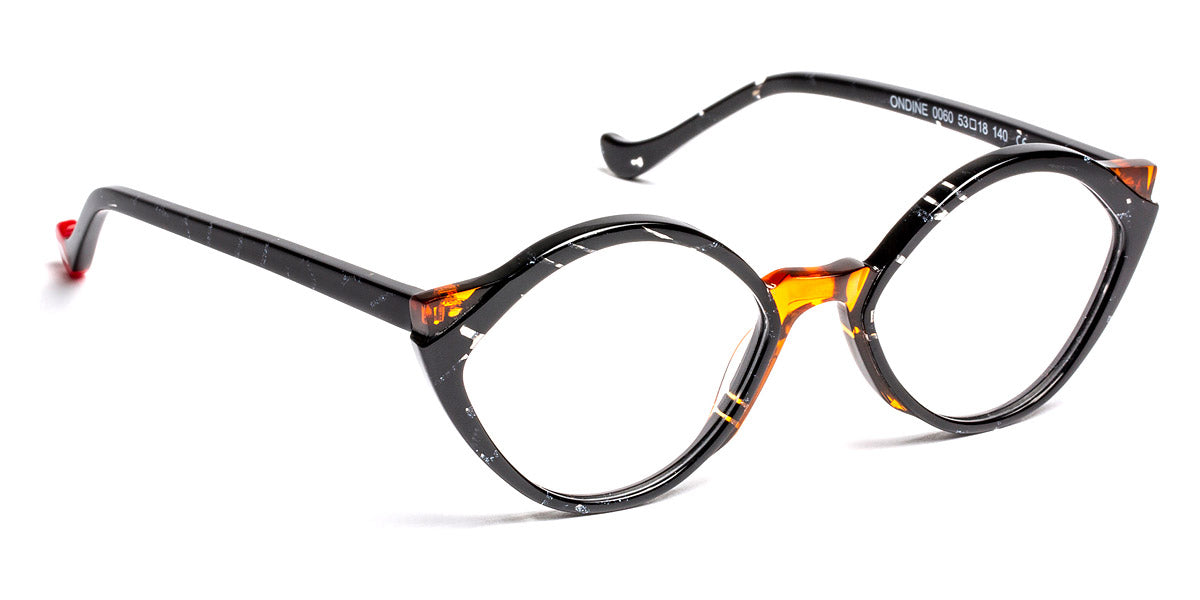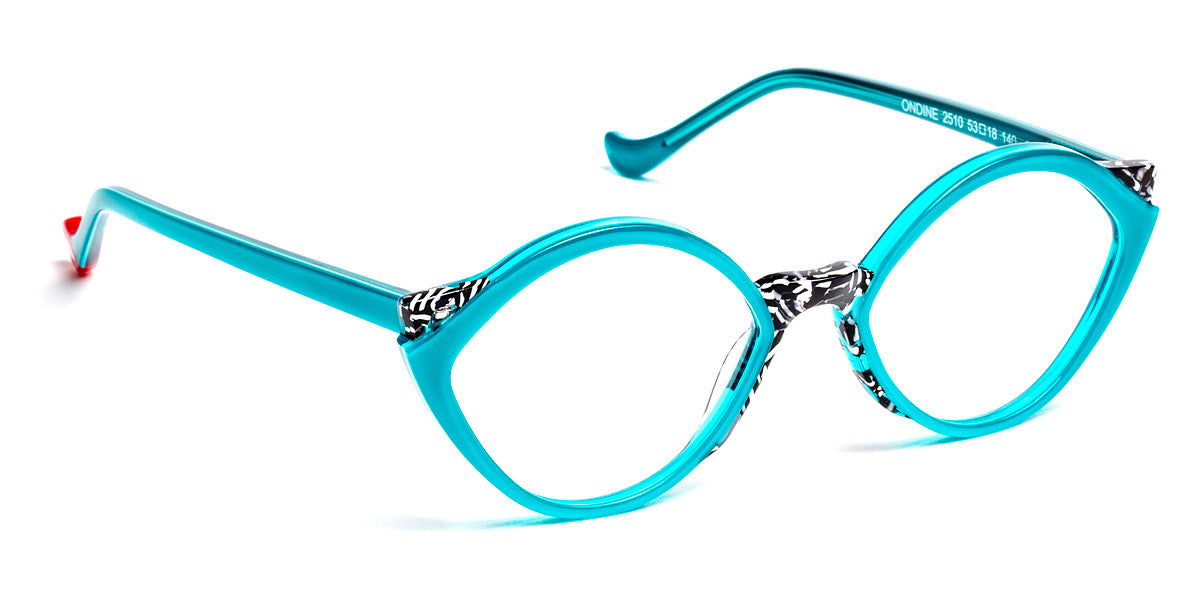 Ondine Eyeglasses by J.F. Rey. Color: 0060 Black and Crystal Glossy/Orange, 0090 Black/Terracotta Transparent, 2000 Blue/Black and Crystal Striped, 2510 Turquoise/White and Black, Size: 53-18-140. Dive into a realm of enchantment with the Ondine glasses by J. F. Rey. Inspired by mythical water nymphs, these frames boast fluid lines and delicate detailing that capture the essence of elegance. The translucent hues and graceful curves evoke a sense of ethereal beauty, making Ondine the perfect choice for those who want to add a touch of enchantment to their everyday style.
