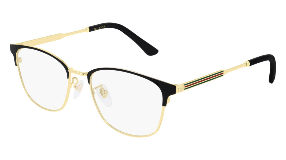 GG0609OK Eyeglasses by Gucci. Color: Black/Gold, Black/Gunmetal, Ruthenium, Size: 52-18-145. Gucci glasses are glamorous and chic, with bold contours and exaggerated volumes, which are ultimate forms of self-expression. Inspired by the vintage era, the reinterpreted iconic eyewear silhouettes are embellished with elaborate decorations and bright colors. Each and every design represents the pinnacle of Italian craftsmanship and is unsurpassed for its quality and attention to detail. Every new collection is a range of striking shapes and colors; an outstanding mix of playful vibes with retro undertones.