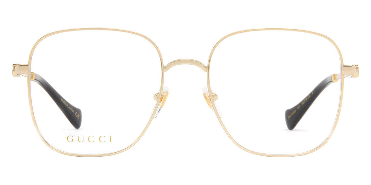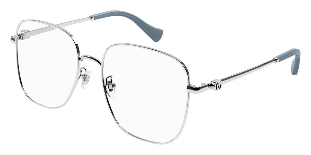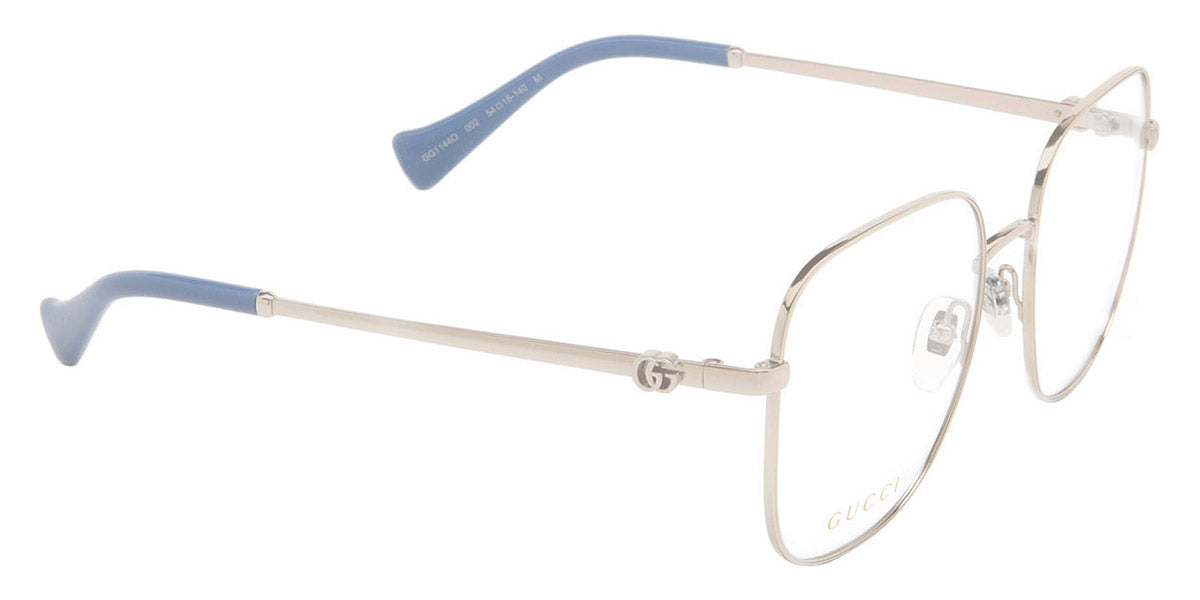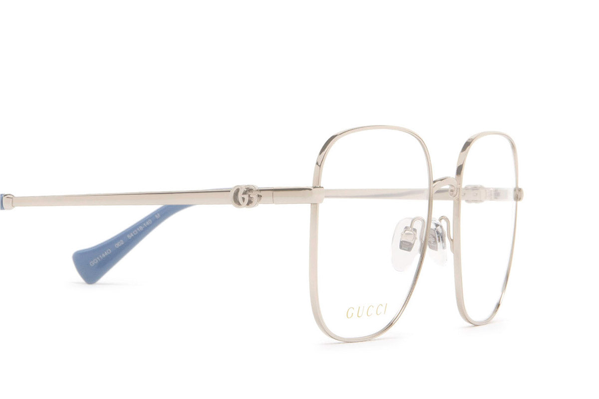 GG1144O Eyeglasses by Gucci. Color: Gold, Silver, Size: 54-18-140. Gucci glasses are glamorous and chic, with bold contours and exaggerated volumes, which are ultimate forms of self-expression. Inspired by the vintage era, the reinterpreted iconic eyewear silhouettes are embellished with elaborate decorations and bright colors. Each and every design represents the pinnacle of Italian craftsmanship and is unsurpassed for its quality and attention to detail. Every new collection is a range of striking shapes and colors; an outstanding mix of playful vibes with retro undertones.
