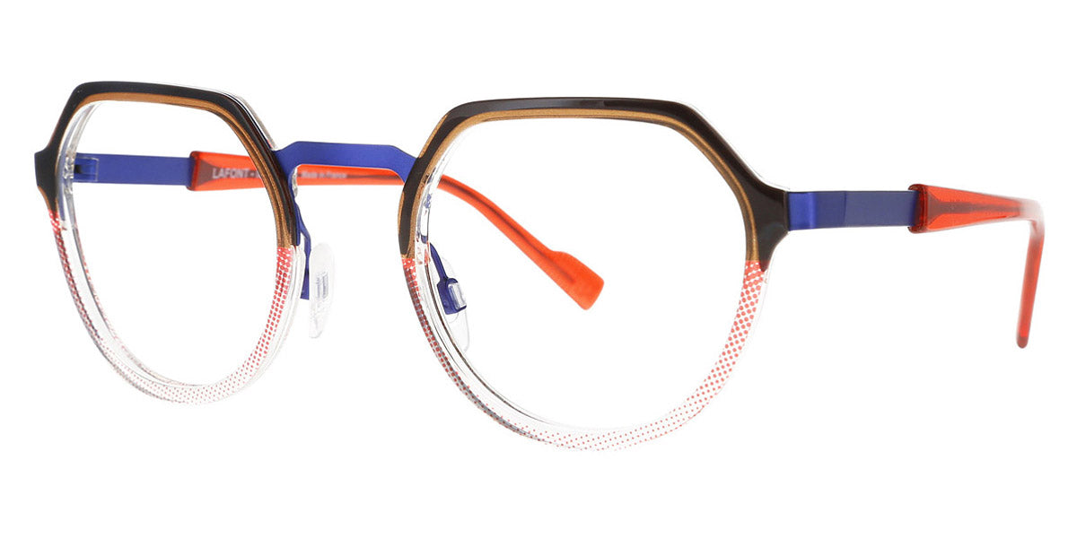 Outsider Eyeglasses by Lafont® Color: Yellow 8514, Blue 3753, Green 4522, Orange 8514, Size: 49-23-136. If you are a fan of the charming and elegant Parisian style, the Lafont glasses are to your liking! By experimenting with shapes, materials and colors, the designers create eye,catching styles that will add an artistic look to any outfit. The frames feature delicate silhouettes and fascinating colorations to stand out from the rest. The process of manufacturing a pair of Lafont glasses takes 8 to 14 weeks and involves 120 to 220 successive operations, depending on the complexity of the frame. Most of these processes are manual, which makes Lafont eyewear a real work,of,art.
