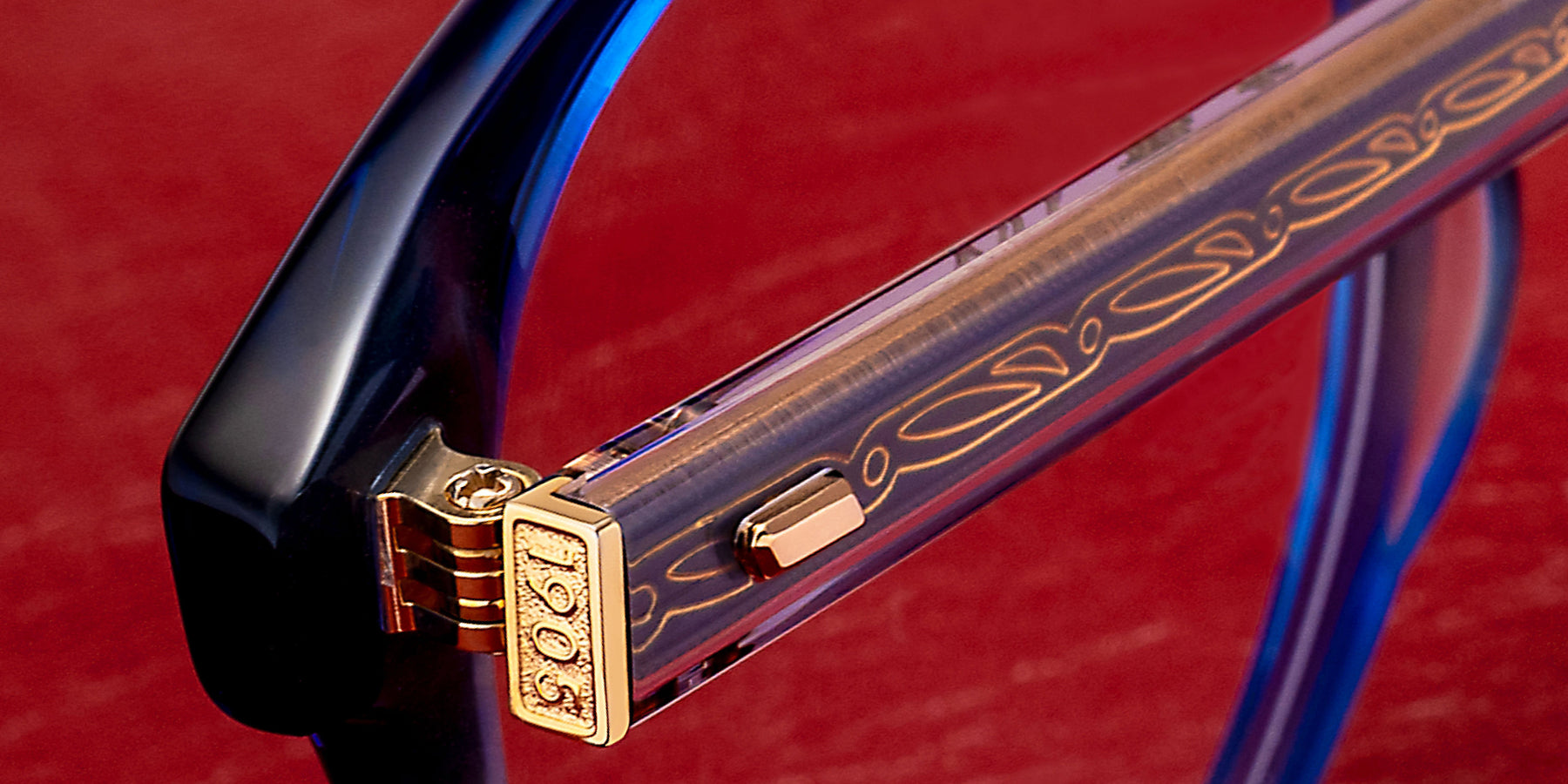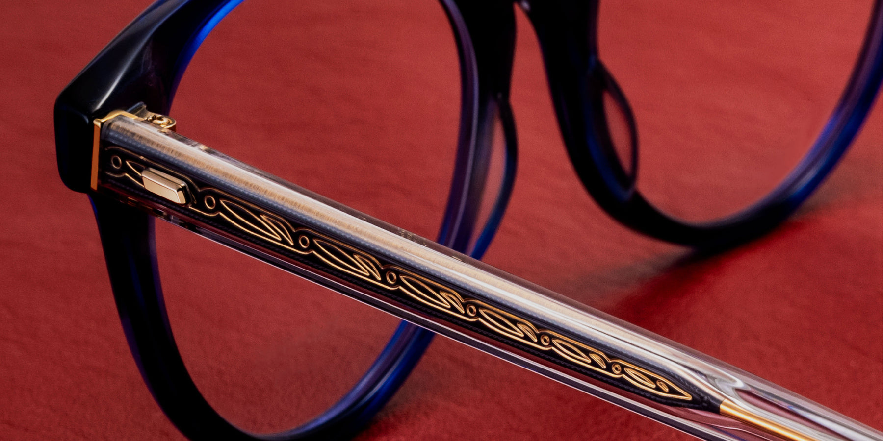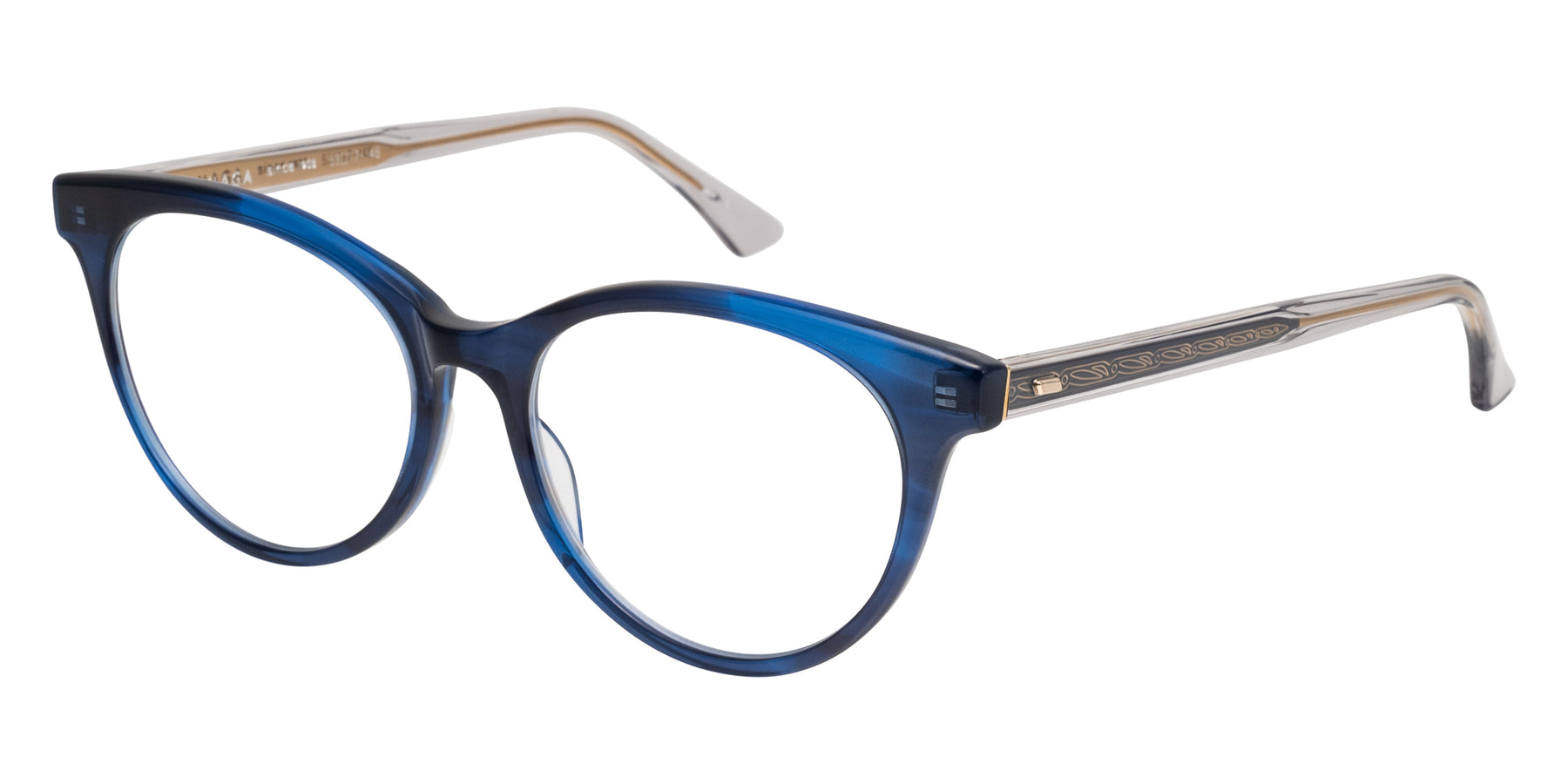 Masunaga® KOUKI 104 Eyeglasses by Masunaga®. Color: 39 BK-DEMI, 25 Navy, 14 TAUPE, Size: 53-17-145. Kouki 104 is a fox shape with a deep, soft top and bottom. The botanical patterned temple core, a jutting decoration, and three-dimensional rivets increase the frame's grade. In particular, the #25 Navy creates a rich impression with the gold visible from the botanical pattern of the temple and the front blue harmony.