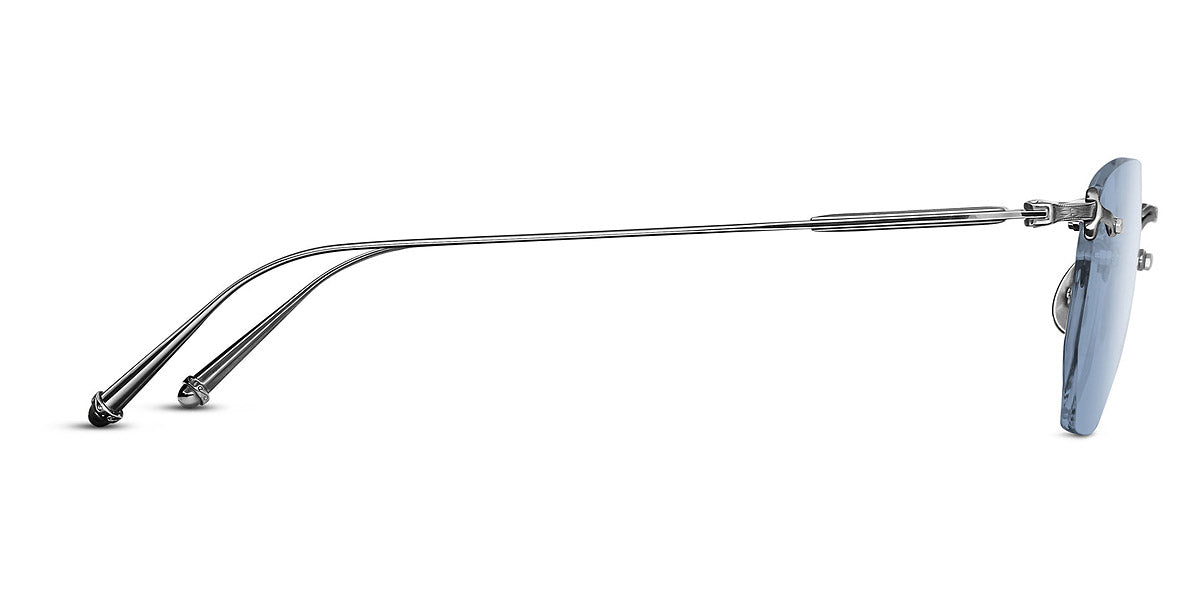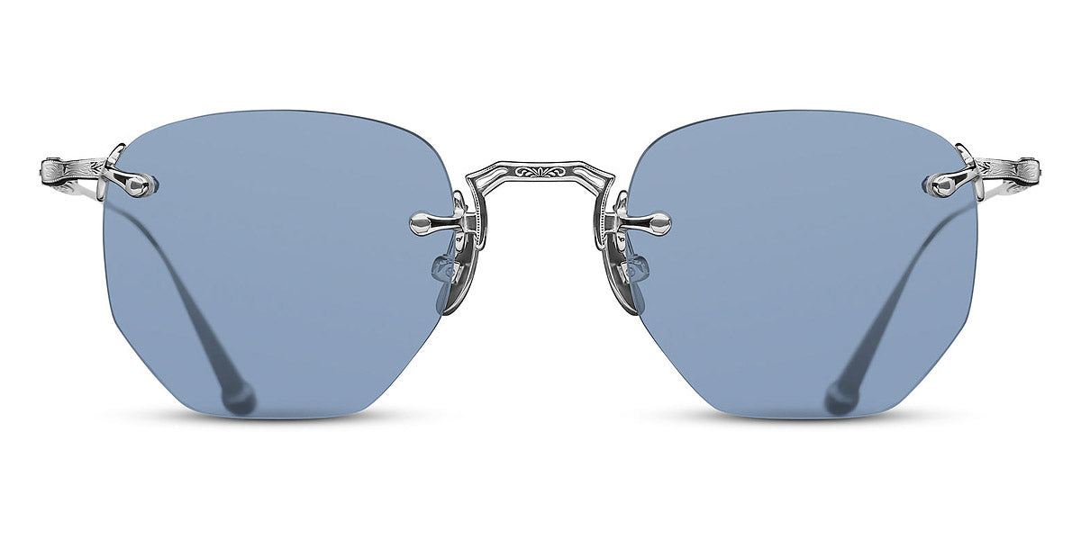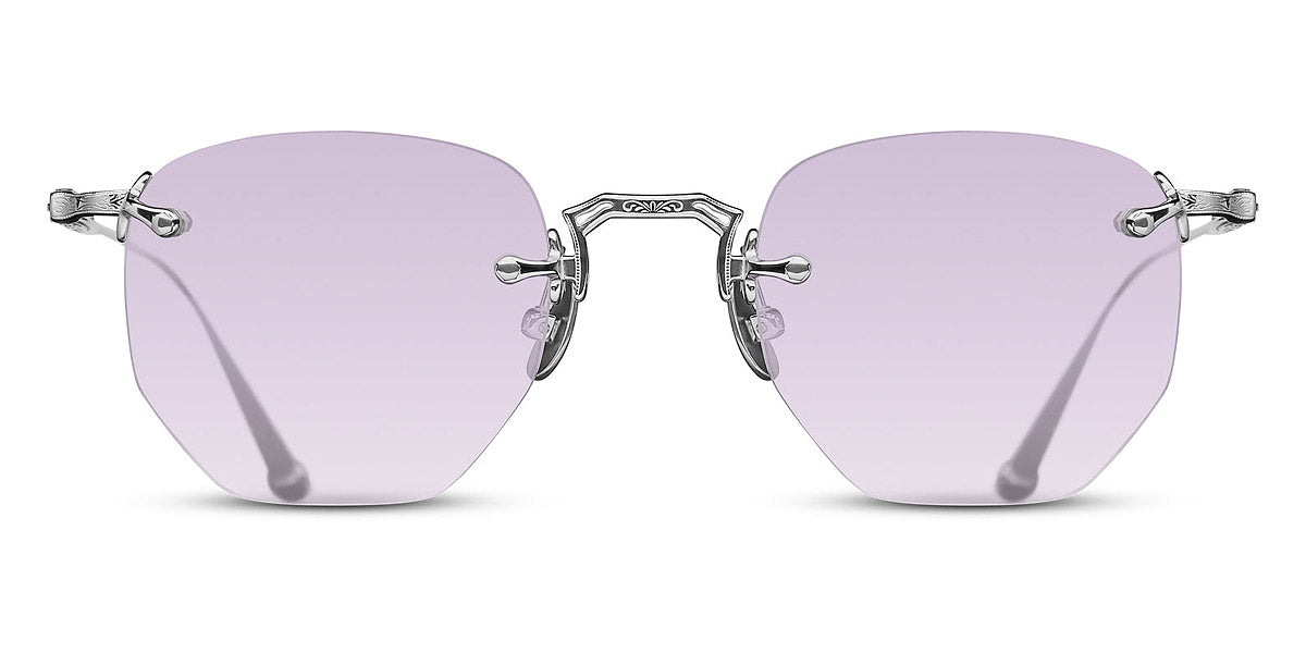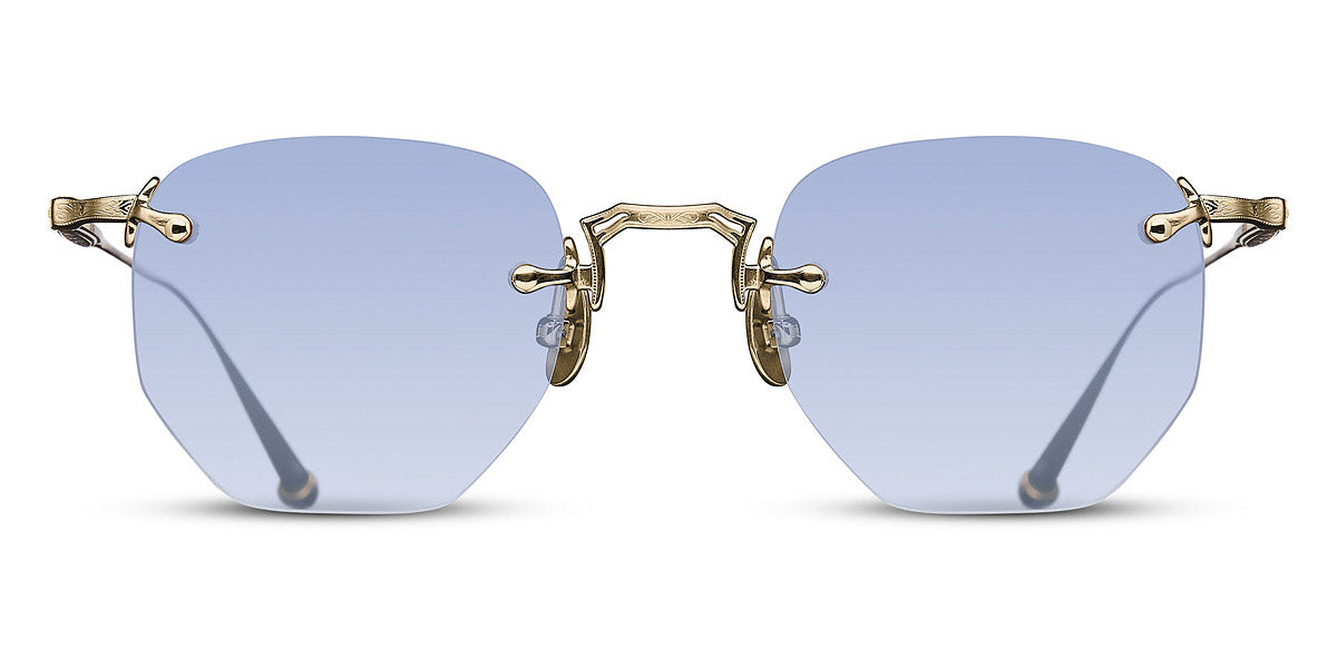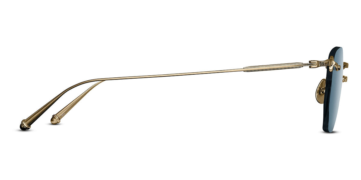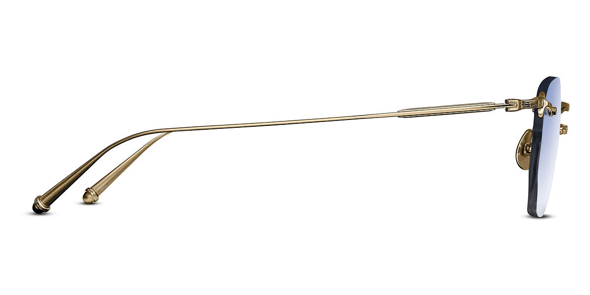 M3104-A Sunglasses by Matsuda. Shape: Geometric, Color: Brushed Gold / Cafe Blue Gradient, Brushed Gold / Blue Grey, Antique Gold / Sage Green, Palladium White / Cafe Violet Gradient, Palladium White / Cobalt Blue, Size: 46-22-145. Step up your eyewear game with Matsuda's M3104-A, a hexagonal drill mount style that exhibits ingenuity and finesse. Precision-engineered from ultra-lightweight titanium, this modern take on a timeless rimless design features hand-engraved upper and lower temple accents crafted from flexible beta titanium. Expertly made in Japan, the M3104-A tastefully balances classic construction with innovative design.