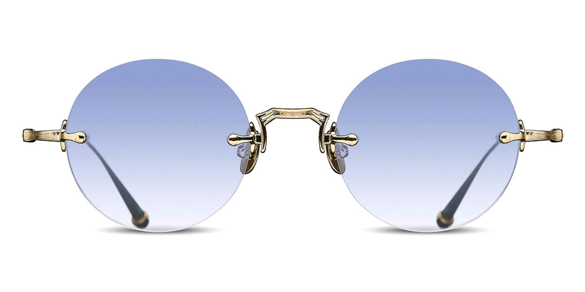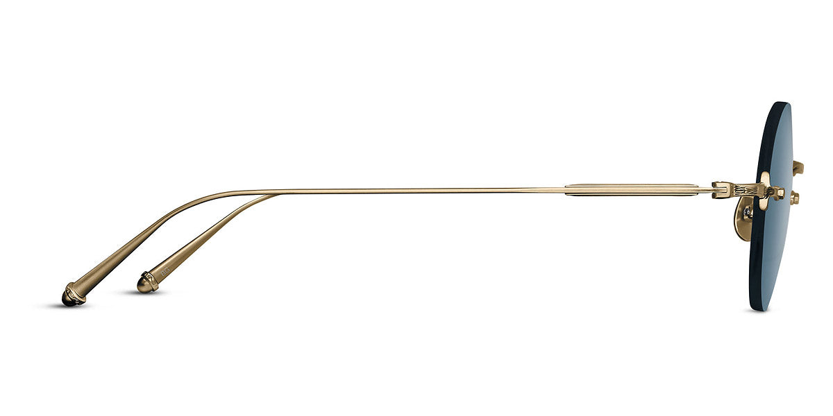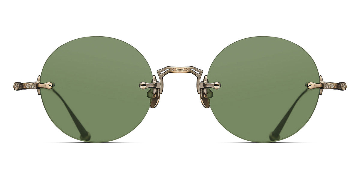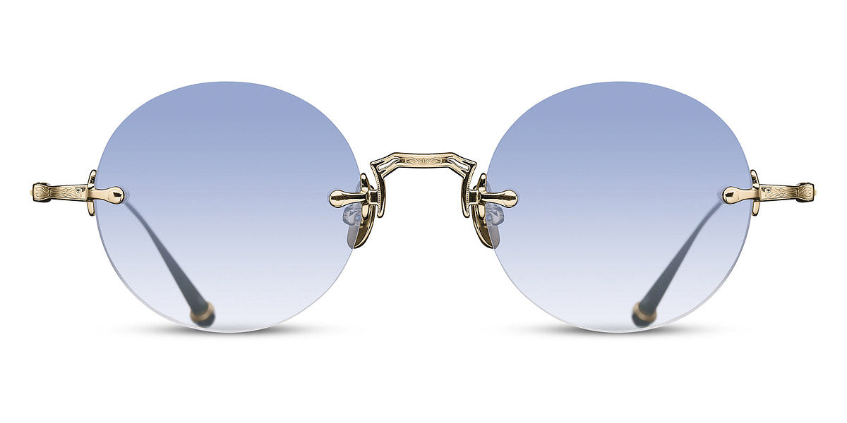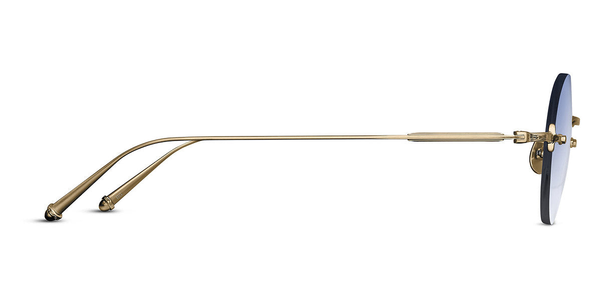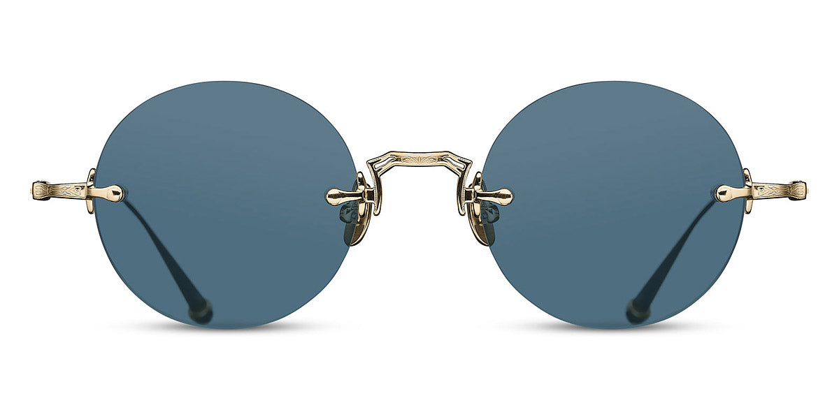 M3105-D Sunglasses by Matsuda. Shape: Round, Color: Brushed Gold / Blue Grey, Brushed Gold / Cafe Blue Gradient, Antique Gold / Sage Green, Palladium White / Cafe Violet Gradient, Palladium White / Cobalt Blue, Size: 47-22-145. The M3105-D is an exquisite round rimless style expertly crafted with an ultra-light titanium frame. Its intriguing rimless design dates back to the late 1800s, when it was conceived as an innovation to create lighter and more comfortable eyewear. The modern interpretation features stunning hand-engraved detailing on the top and bottom of the beta titanium temples, perfectly complementing the classic construction. Meticulously crafted in Japan, you can expect lightweight durability and endless comfort from the flexible beta titanium temples.
