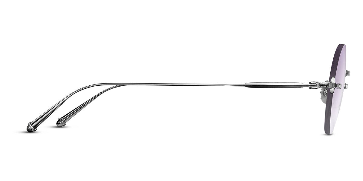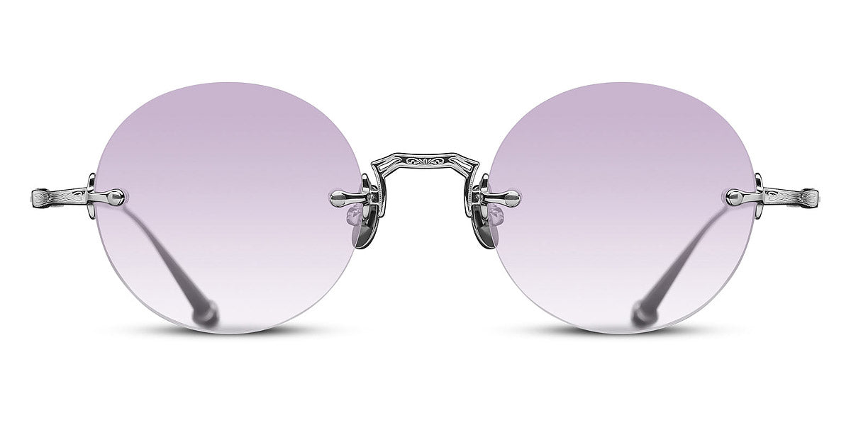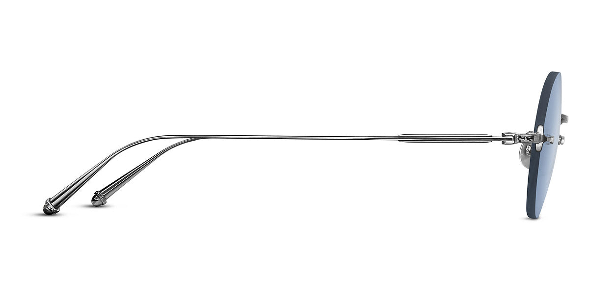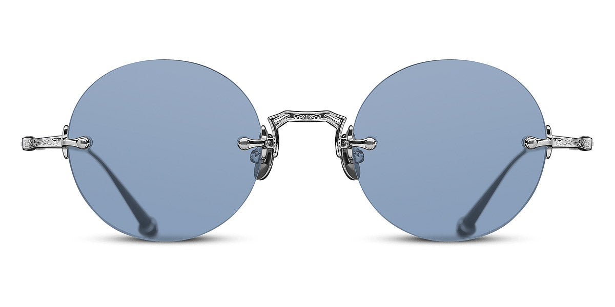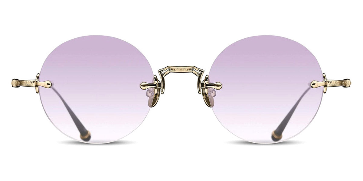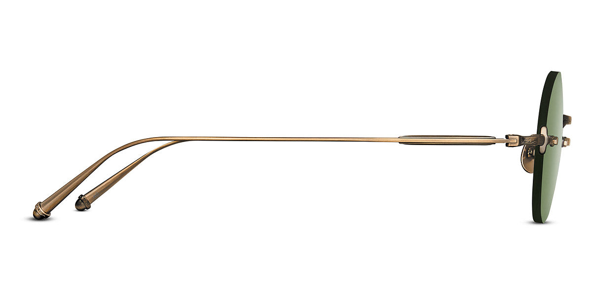 M3105-D Sunglasses by Matsuda. Shape: Round, Color: Brushed Gold / Blue Grey, Brushed Gold / Cafe Blue Gradient, Antique Gold / Sage Green, Palladium White / Cafe Violet Gradient, Palladium White / Cobalt Blue, Size: 47-22-145. The M3105-D is an exquisite round rimless style expertly crafted with an ultra-light titanium frame. Its intriguing rimless design dates back to the late 1800s, when it was conceived as an innovation to create lighter and more comfortable eyewear. The modern interpretation features stunning hand-engraved detailing on the top and bottom of the beta titanium temples, perfectly complementing the classic construction. Meticulously crafted in Japan, you can expect lightweight durability and endless comfort from the flexible beta titanium temples.