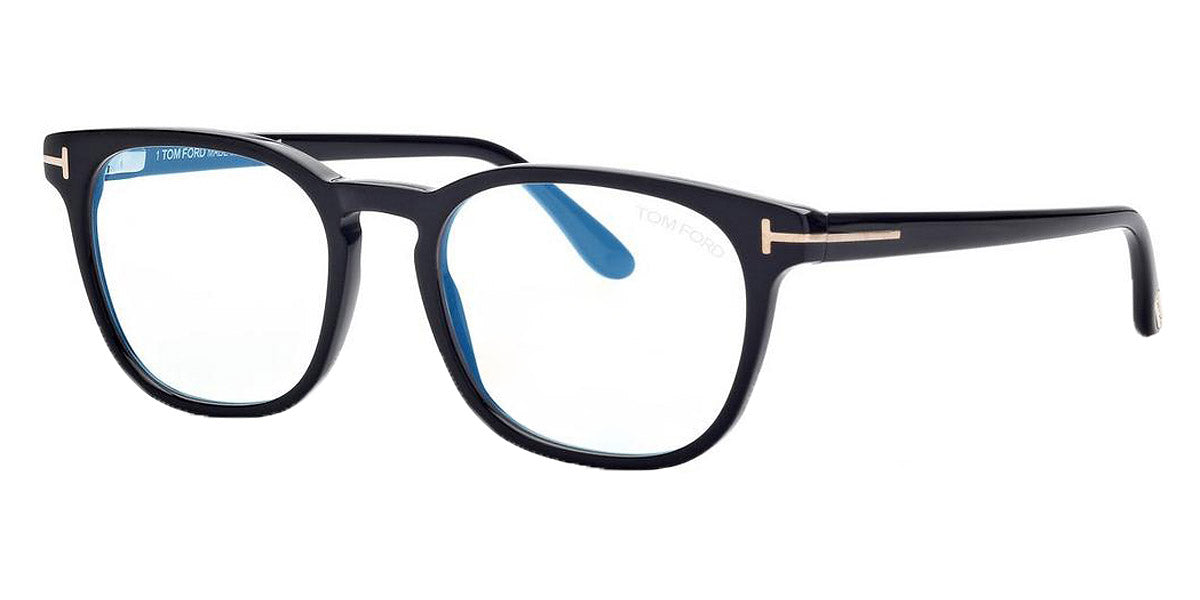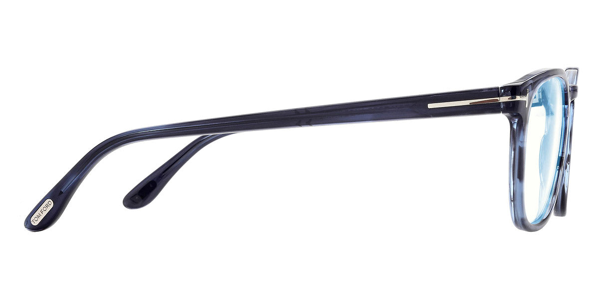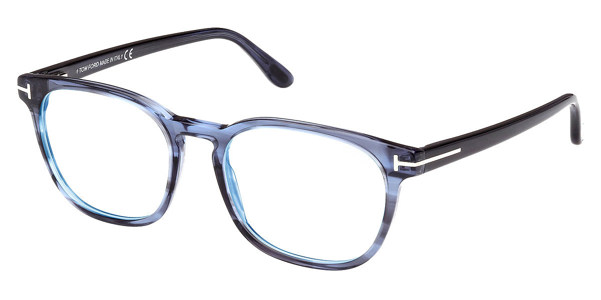FT5868-B Eyeglasses by Tom Ford. Color: Shiny Transparent Striped Grey / t" Logo / Blue Block Lenses, Shiny Black / Shiny Black, Dark Havana / Dark Havana, Blue/Striped / Blue/Striped, Size: 53-18-145.