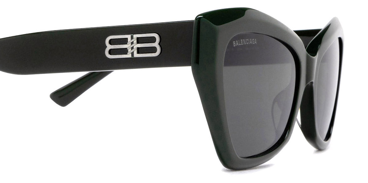 BB0271S Sunglasses by Balenciaga. Shape: Cat-Eye, Material: Acetate, Color: Green, Size: 56-19-140. The Balenciaga Eyewear collections consist of sunglasses and eyeglasses frames that combine a simple new style with the fashion house's desire to be inspired by technological innovation in its shapes and silhouettes. They embody revolutionary trends and fashionable realism. All models of glasses are marked with the brand's corporate logo, interpreted in their own way in different styles. The black double monogram "B" is set on transparent nose pads, creating a floating and weightless effect. The logo of the brand's sunglasses is applied to the mirror coating, which in different variations is always presented on the left temple. Extraordinary designs and unconventional materials mixed with more classic ones make Balenciaga eyewear unique and easily recognizable.