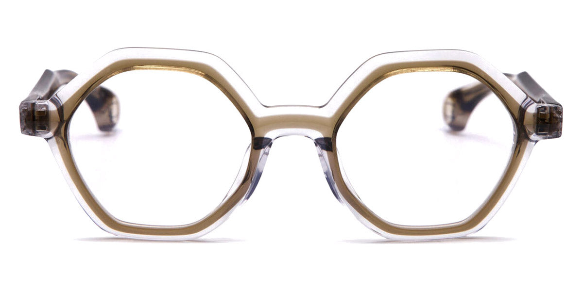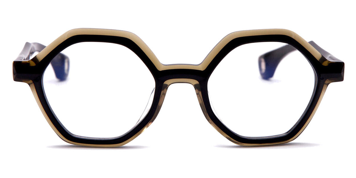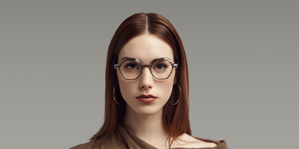 NOYES Eyeglasses by Blake Kuwahara. Color: Black, Earth, Size: 48-21-140. Bringing a daring edge to eyewear with its unique hexagonal pantos shape, the NOYES creates a striking balance between bold geometry and soft curves. The lightweight acetate frames ensure comfort, while the one-of-a-kind shape offers a standout look. With the intriguing translucency of Blake Kuwahara's iconic double-contour design and a sturdy build meant to make it through the daily wear and tear, the NOYES eyeglasses are your ticket to stylish comfort.