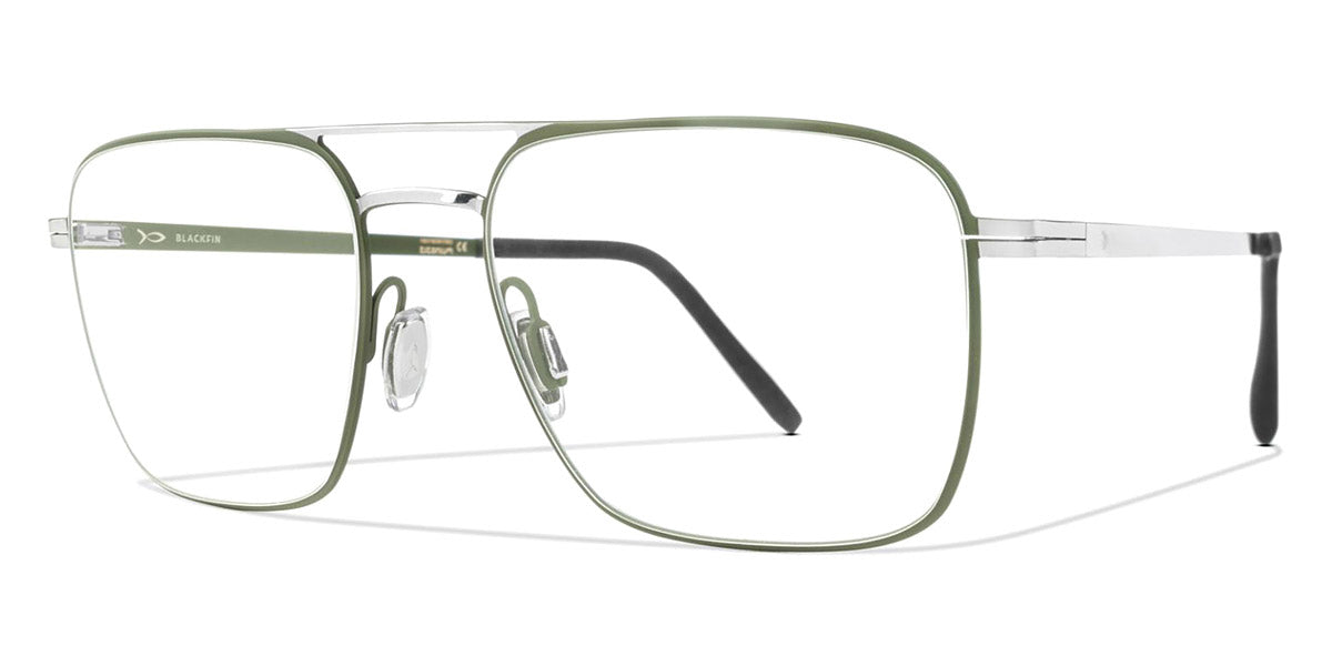 FRESNO Eyeglasses by Blackfin. Color: Gunmetal, Blue/Red, Black/Blue, Army Green/Silver, Brown/Silver, Size: 55-18-145. Basic yet undeniably sleek, the Blackfin FRESNO aviators strip away the unnecessary, leaving only pure, modern elegance. These glasses embody the essence of minimalist design, where every detail serves a purpose. The aviator shape is timeless, while the clean lines and precise construction give it a contemporary edge. Hand-crafted from top-quality titanium and refined to perfection, the FRESNO is for those who value the beauty of simplicity, where less is truly more.