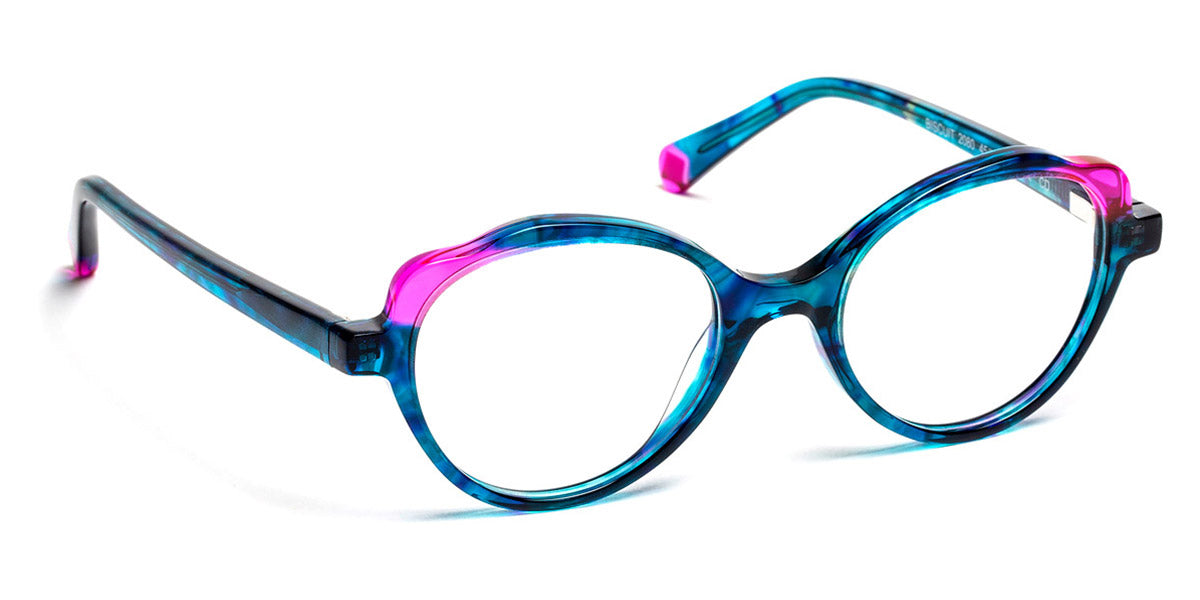 Biscuit Eyeglasses by J.F. Rey. Color: 2080 Blue Lace/Fuchsia, 3030 Coral Red, 4010 Turquoise/Sky Glitter, 7050 Purple/Yellow, 7550 Plum/Yellow/Blue, 8020 Flower Pink/Blue, Size: 45-17-125.