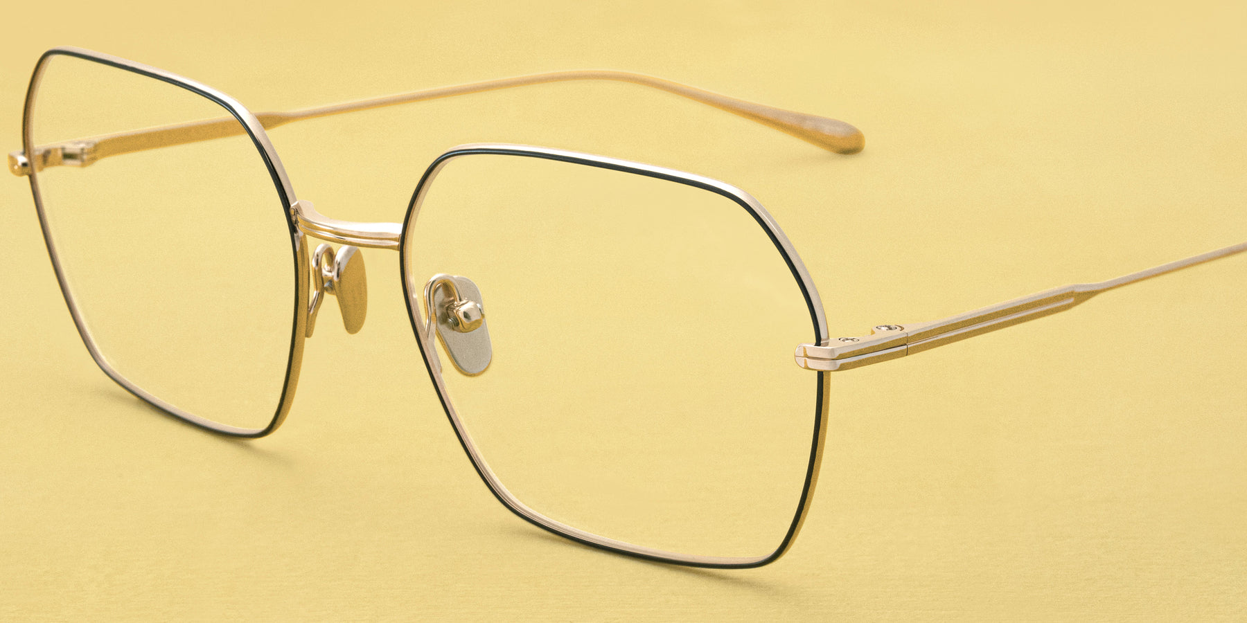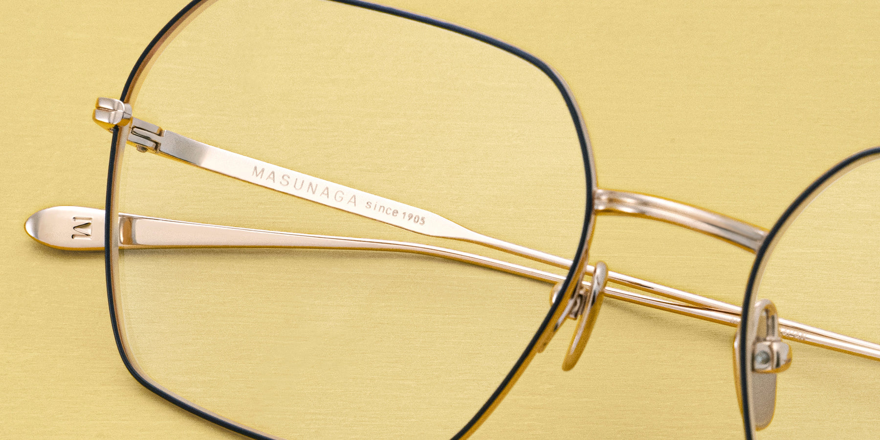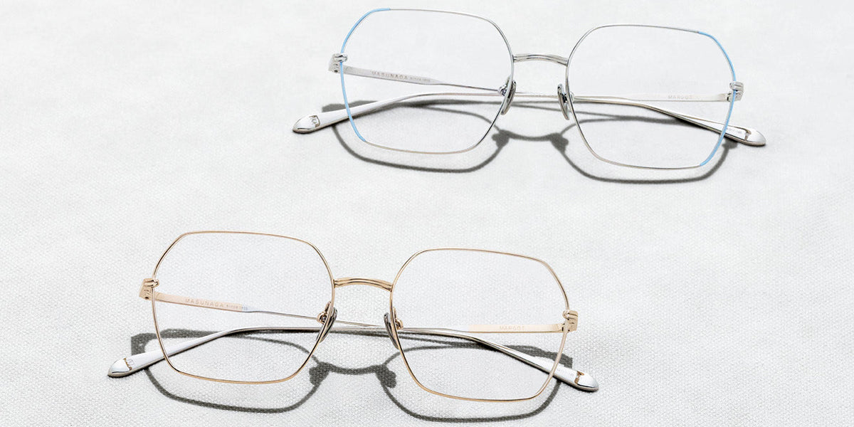Masunaga® MARGOT Eyeglasses by Masunaga®. Color: 45 Gold/Navy, 33 BR/PK GOLD, 22 LBL/SILVER, 11 GOLD/SILVER, Size: 54-17-145. MARGOT was created by combining the big frame, which was popular between 1970 and 1980 with sophistication, brings out the inner strength of a woman. The simple lines and unique coloring of MASUNAGA suggest a new way of creating a big shape. The silver-based #22 features an attractive blue that is the highlight, creating elegance.
