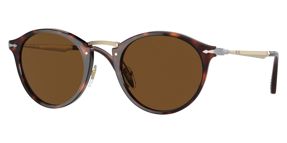 PO3166S Sunglasses by Persol. Shape: Phantos, Material: Metal, Frame Type: Full Rim, Color: 24/31 Havana / Green, 24/57 Havana / Polarized Brown, 960/56 Striped Brown / Light Blue, Size: 49-22-145, 51-22-145.