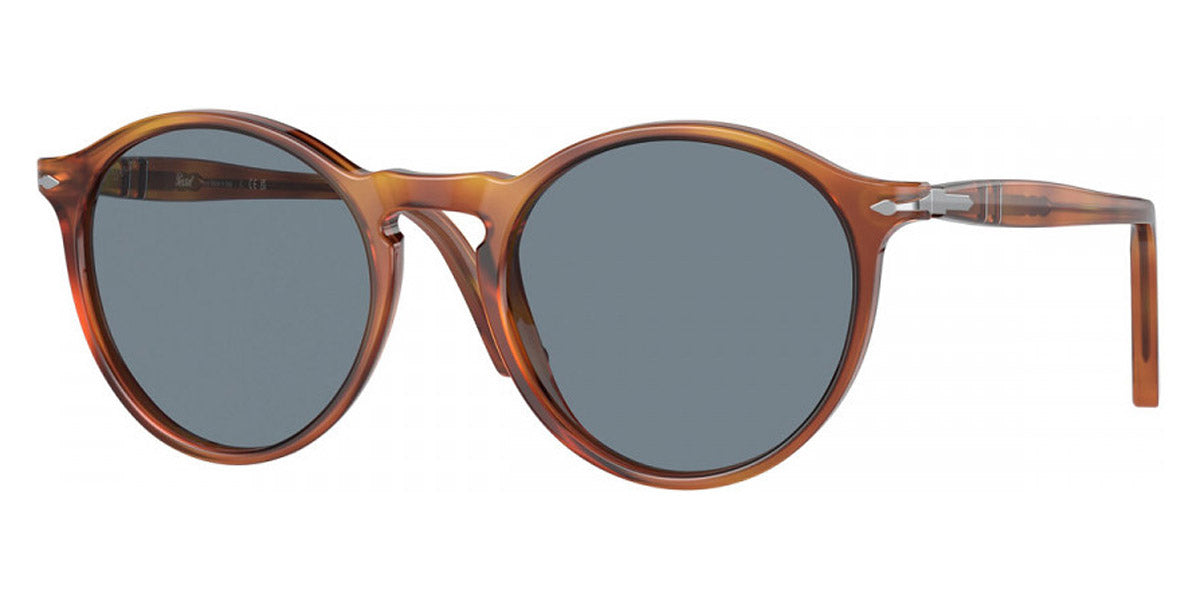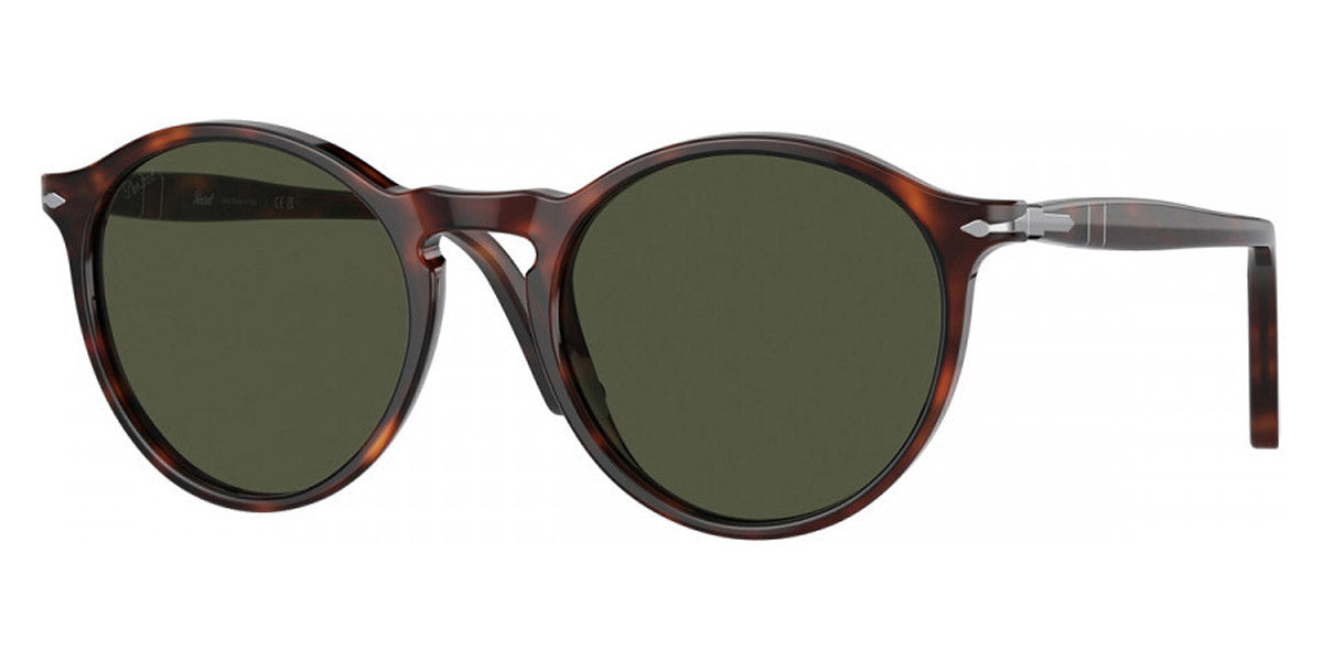 PO3285S Sunglasses by Persol. Shape: Round, Material: Acetate, Frame Type: Full Rim, Color: 24/31 Havana / Green, 96/56 Terra Di Siena / Light Blue, Size: 52-19-140.