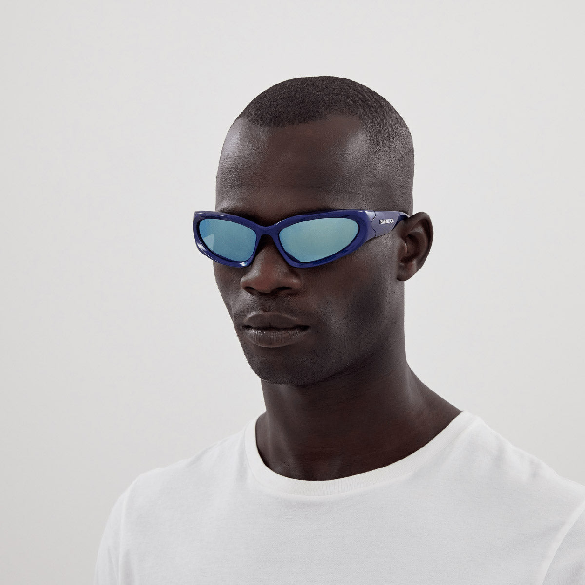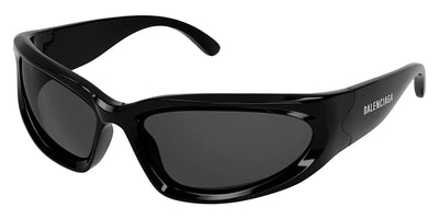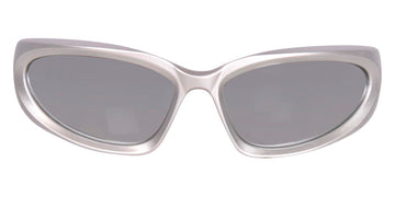BB0157S Sunglasses by Balenciaga. Shape: Wrap, Material: Bio Injection Rilsan, Color: Black / Gray, Silver / Silver Mirrored, Size: 65-17-125. The Balenciaga Eyewear collections consist of sunglasses and eyeglasses frames that combine a simple new style with the fashion house's desire to be inspired by technological innovation in its shapes and silhouettes. They embody revolutionary trends and fashionable realism. All models of glasses are marked with the brand's corporate logo, interpreted in their own way in different styles. The black double monogram "B" is set on transparent nose pads, creating a floating and weightless effect. The logo of the brand's sunglasses is applied to the mirror coating, which in different variations is always presented on the left temple. Extraordinary designs and unconventional materials mixed with more classic ones make Balenciaga eyewear unique and easily recognizable.