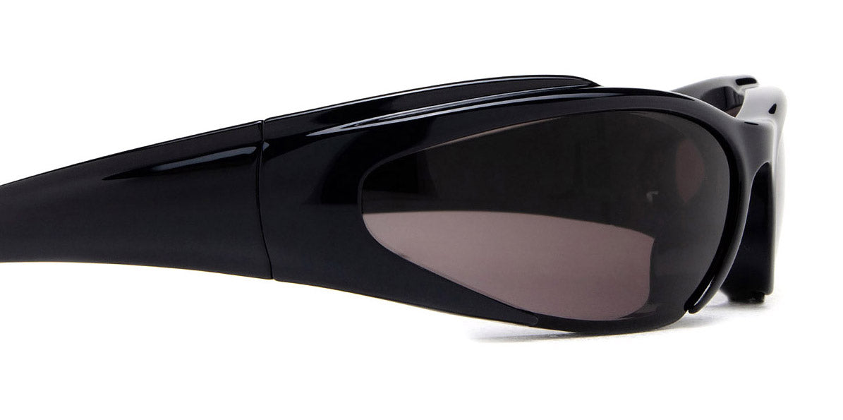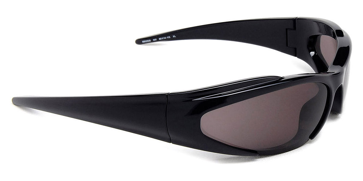 BB0253S Sunglasses by Balenciaga. Shape: Wrap, Material: Acetate, Color: Black, Size: 80-14-115. The Balenciaga Eyewear collections consist of sunglasses and eyeglasses frames that combine a simple new style with the fashion house's desire to be inspired by technological innovation in its shapes and silhouettes. They embody revolutionary trends and fashionable realism. All models of glasses are marked with the brand's corporate logo, interpreted in their own way in different styles. The black double monogram "B" is set on transparent nose pads, creating a floating and weightless effect. The logo of the brand's sunglasses is applied to the mirror coating, which in different variations is always presented on the left temple. Extraordinary designs and unconventional materials mixed with more classic ones make Balenciaga eyewear unique and easily recognizable.