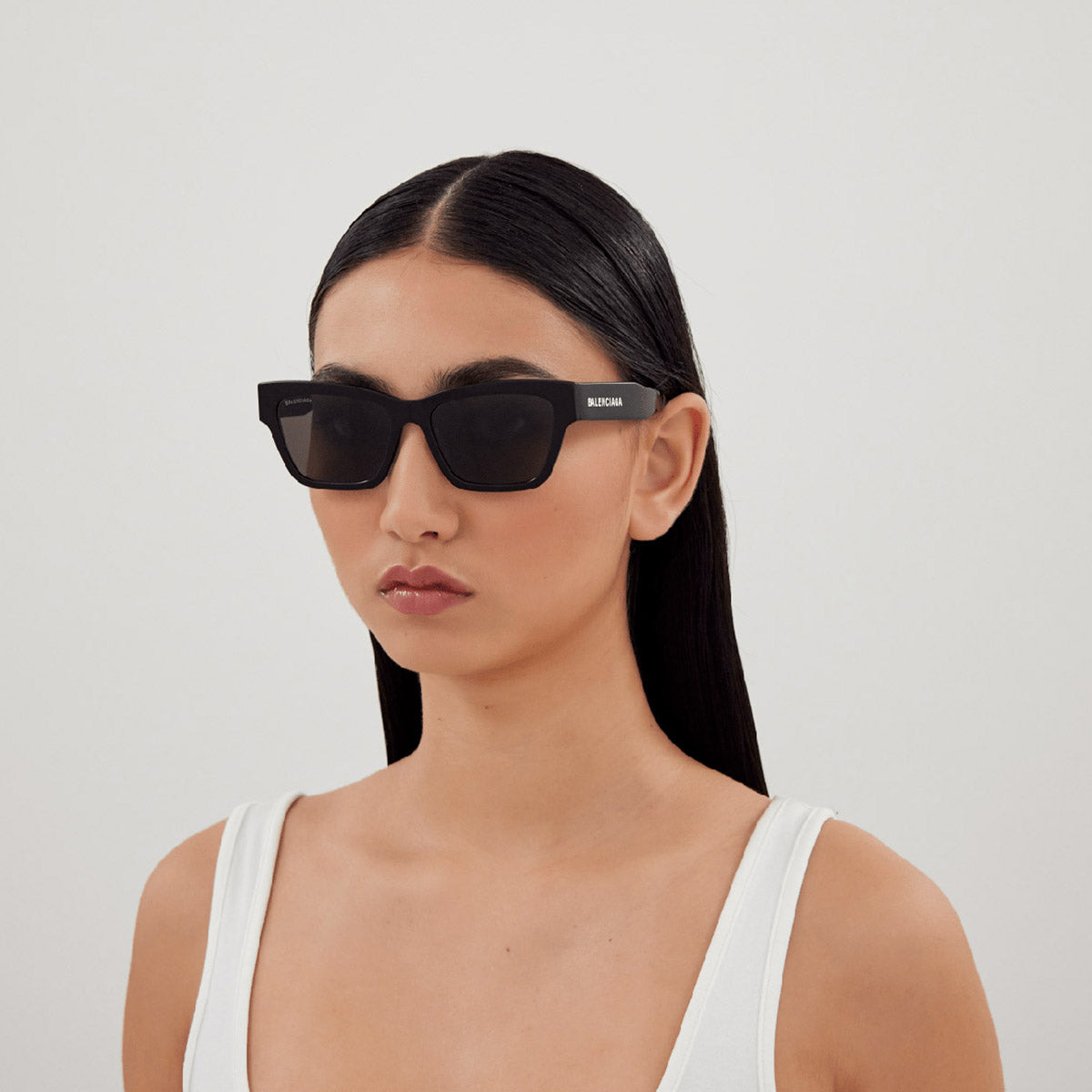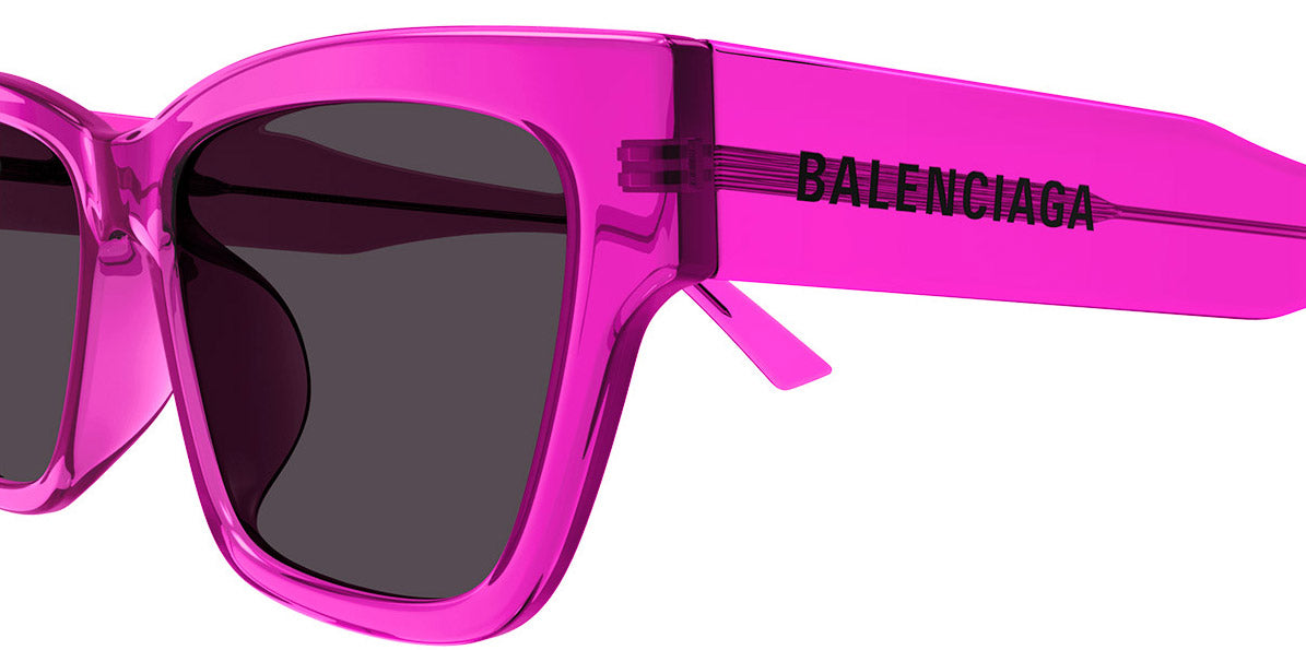 BB0307SA Sunglasses by Balenciaga. Shape: Square, Material: Acetate, Color: Fuchsia, Size: 56-17-145. The Balenciaga Eyewear collections consist of sunglasses and eyeglasses frames that combine a simple new style with the fashion house's desire to be inspired by technological innovation in its shapes and silhouettes. They embody revolutionary trends and fashionable realism. All models of glasses are marked with the brand's corporate logo, interpreted in their own way in different styles. The black double monogram "B" is set on transparent nose pads, creating a floating and weightless effect. The logo of the brand's sunglasses is applied to the mirror coating, which in different variations is always presented on the left temple. Extraordinary designs and unconventional materials mixed with more classic ones make Balenciaga eyewear unique and easily recognizable.