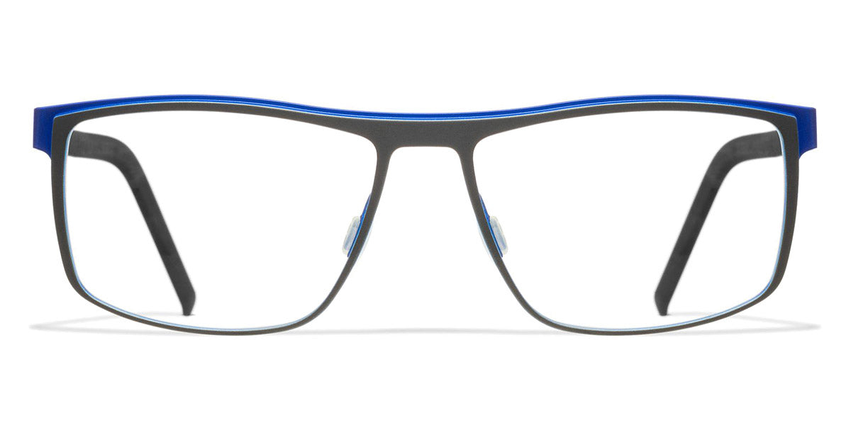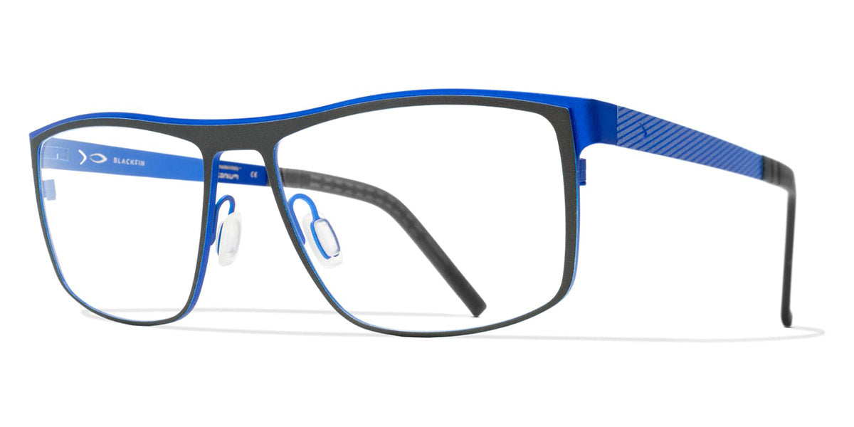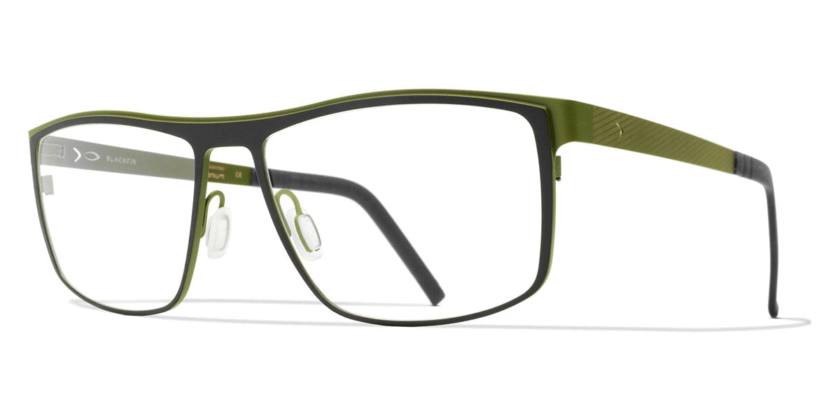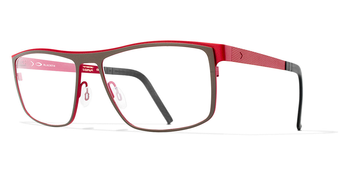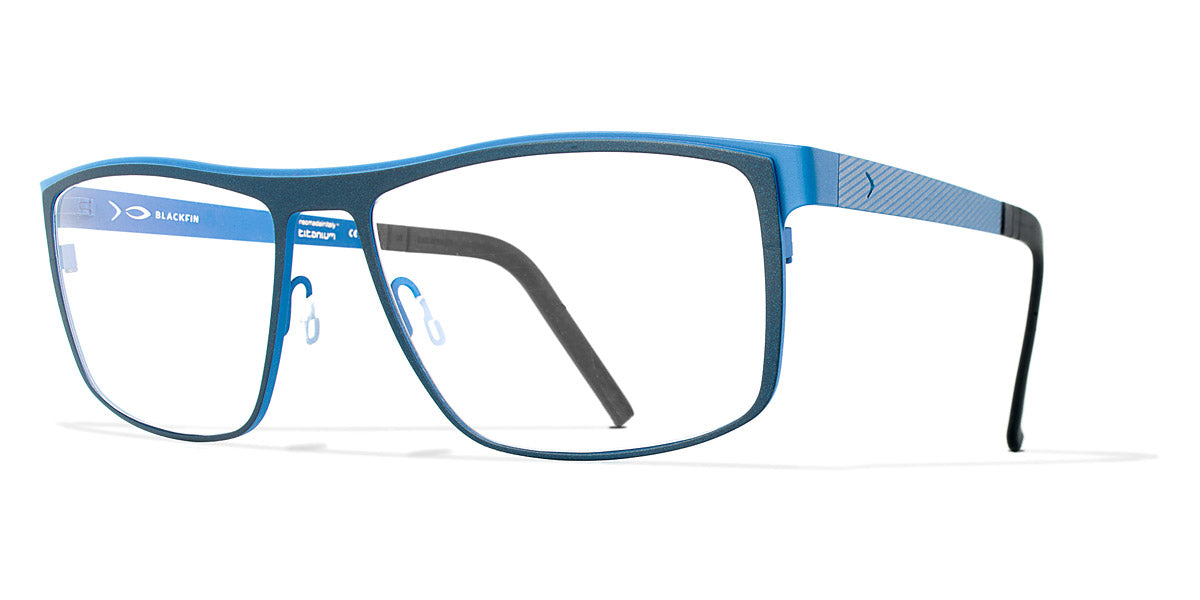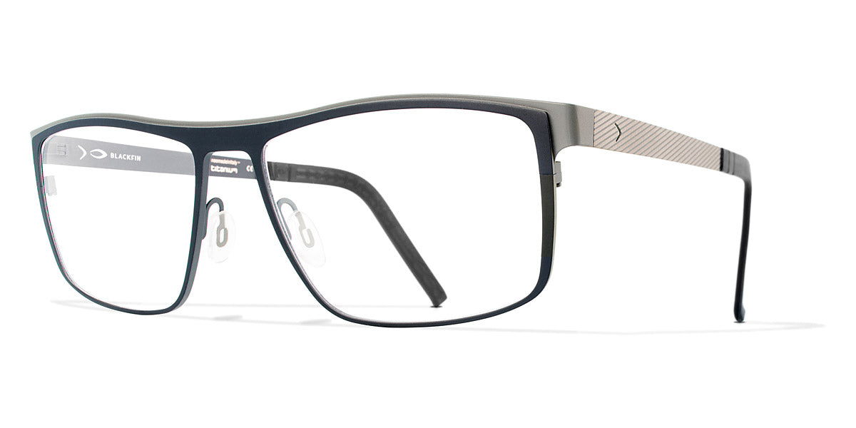 GREENLAND Eyeglasses by Blackfin. Color: Black/Grey, Brown/Red, Navy Blue/Light Blue, Black/Green, Gray/Blue, Size: 57-16-145. Taking classic style to new heights, the Blackfin GREENLAND frames feature an iconic rectangular silhouette with a modern twist. Handcrafted from a single sheet of titanium, they offer a seamless design that’s both hypoallergenic and exceptionally durable. A touch of contrasting hues on the temples adds an element of surprise, making these glasses as visually striking as they are practical. Stay stylish and comfortable with the GREENLAND eyeglasses.