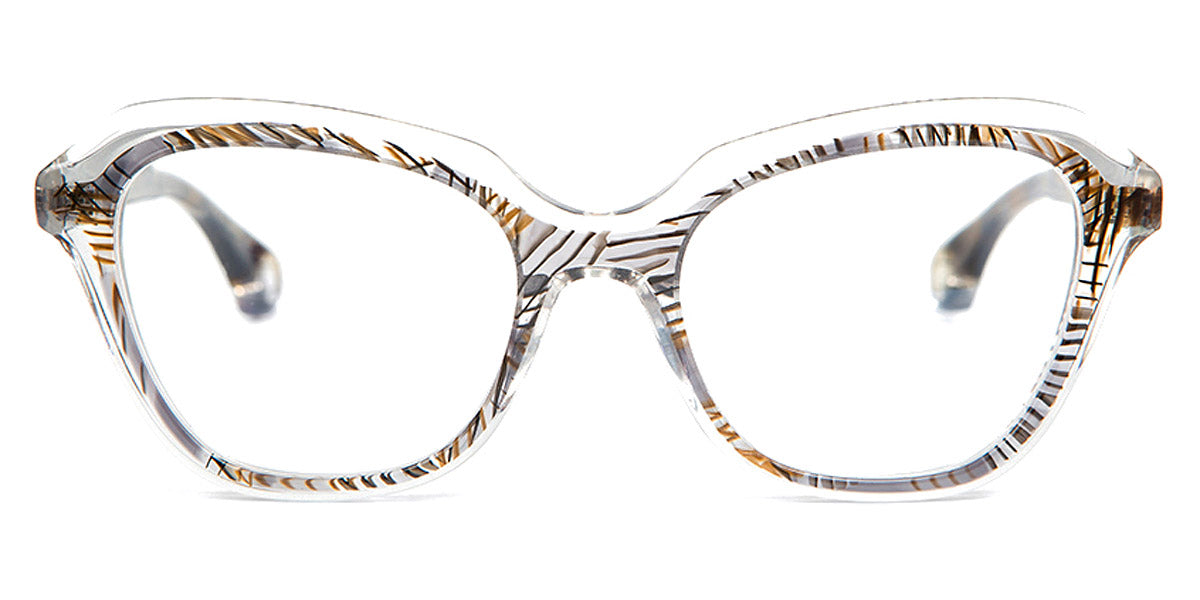MERRILL Eyeglasses by Blake Kuwahara. Color: Crystal, Grey Straw, Mother Of Pearl, Size: 53-20-140. The MERRILL eyeglasses flutter into the spotlight with a striking butterfly silhouette, their translucent inner rim cradled in bold acetate contours. These frames don’t just rest on your face—they elevate it, bringing a sense of poise and daring. The bold outer frame commands attention while the inner clarity adds a delicate contrast. A sure choice for the discerning wearer who wants their eyewear to be as transformative as wings in flight, the MERRILL is a perfect blend of comfort, durability, and ultimate style.