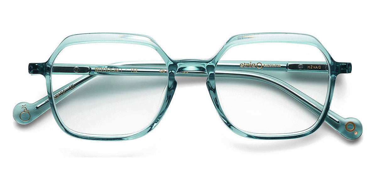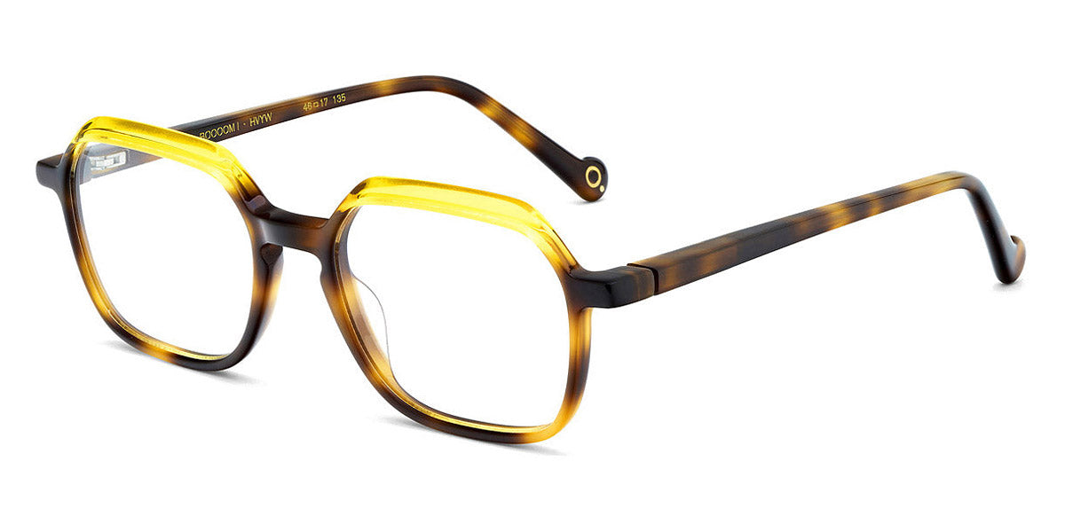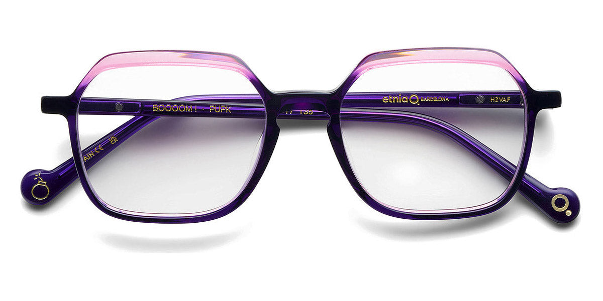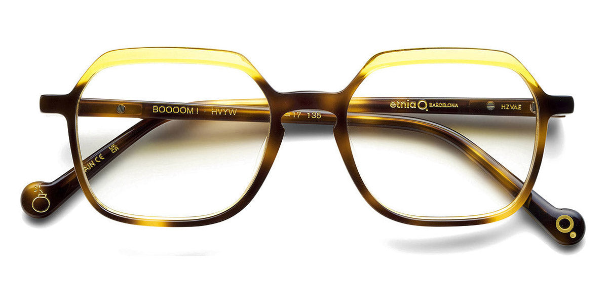 BOOOOM Eyeglasses by Etnia Barcelona. Color: HVYW Havana/Yellow, PUPK Purple/Pink, TQ Blue, BL Blue, Size: 46-16-135. Make an entrance with the bold, angular design of the BOOOOM frames. These eyeglasses are crafted with a modern, edgy shape, ensuring you stand out in any crowd. The vivid colors and premium build make them both playful and practical, blending style with durability. The lightweight Mazzucchelli acetate doesn't weigh you down while ensuring a comfortable, enduring fit. Elevate your eyewear game with the energy-packed BOOOOM.