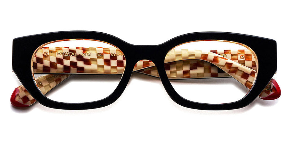 BRUTAL NO.06 SUN Sunglasses by Etnia Barcelona. Color: BK Black, RD Red, WH White, PK Pink, PU Purple, HV Havana, Size: 51-18-145, 51-20-145. Elongated and edgy, the BRUTAL NO.06 SUN stands out with its bold end pieces and distinctive chequered temples. Despite the substantial look of the thick acetate, the frames are surprisingly weightless, ensuring comfort that lasts all day. The translucent finish adds a touch of sophistication to the vibrant hues, creating a dynamic visual impact. Enjoy bold style and perfect UV protection wearing the BRUTAL NO.06 SUN.