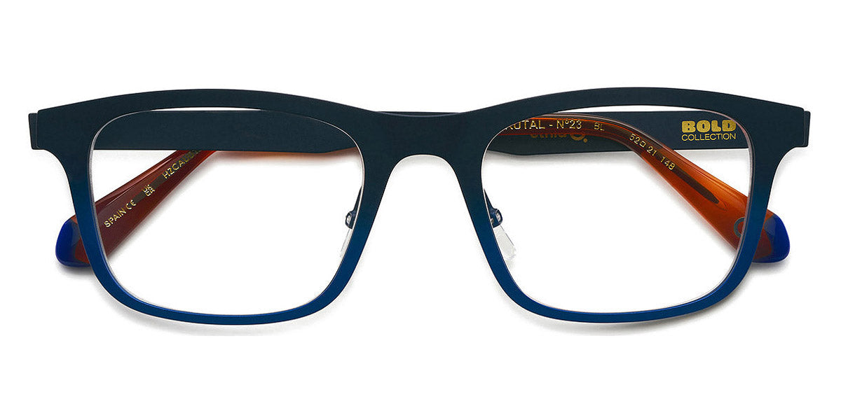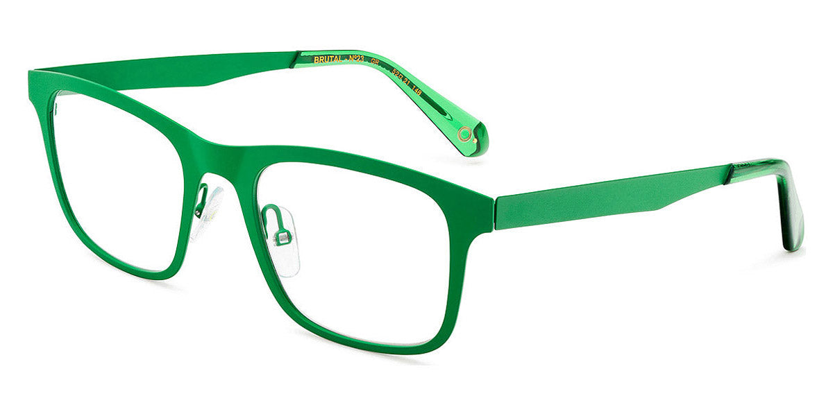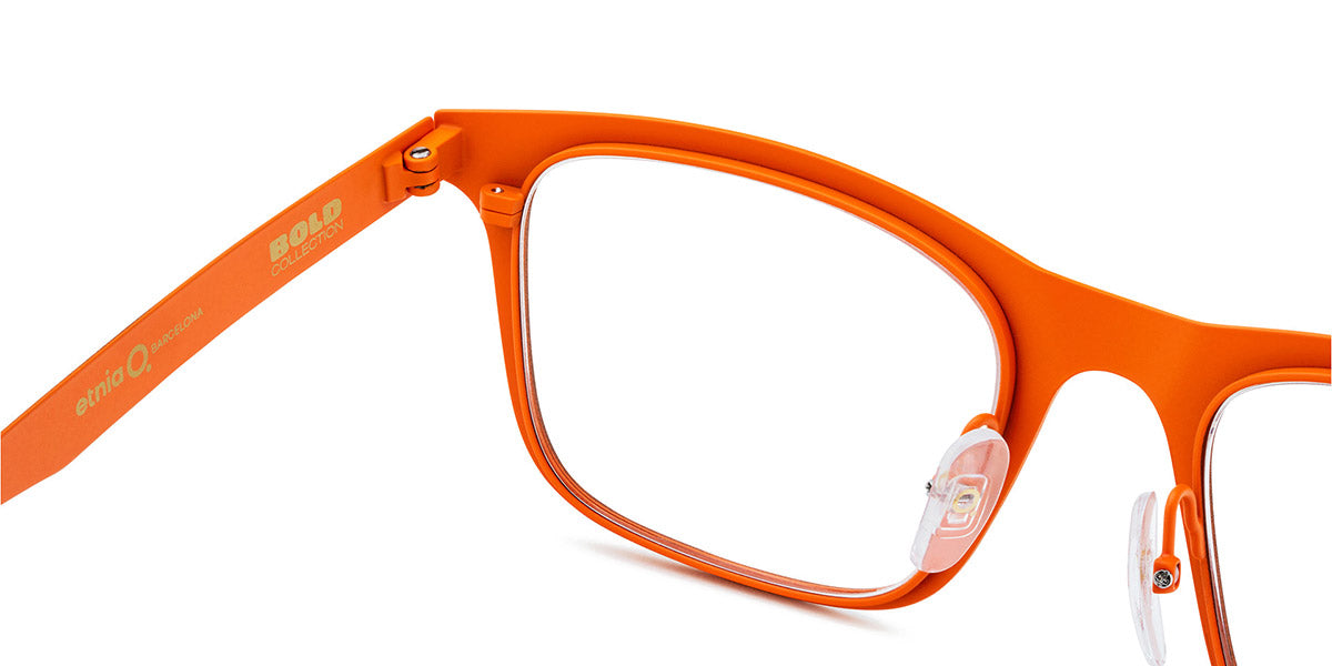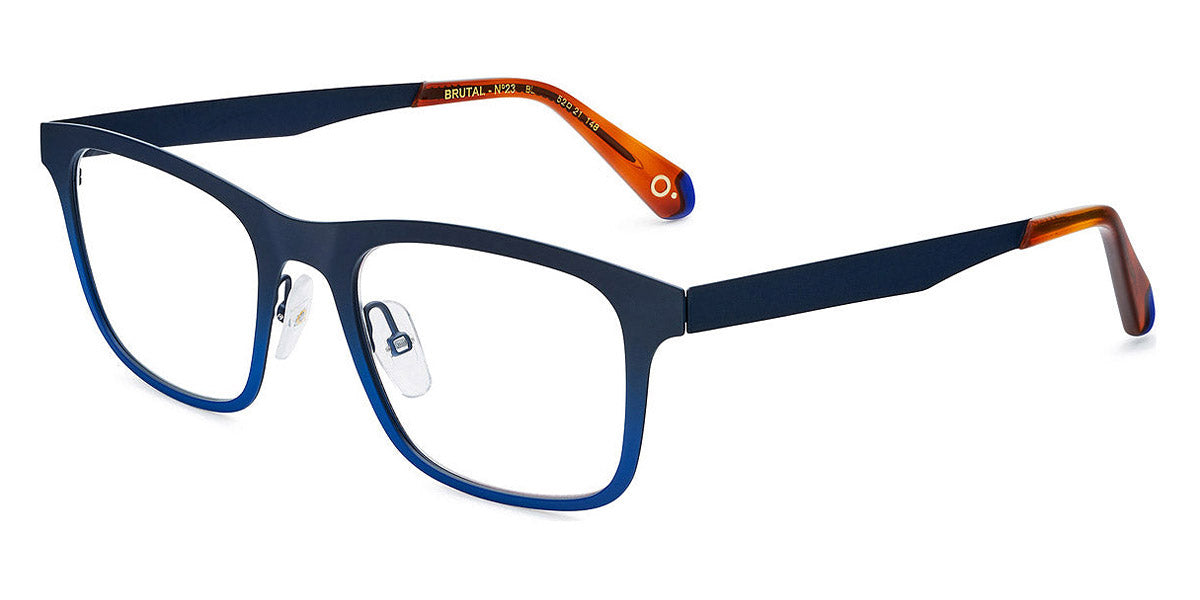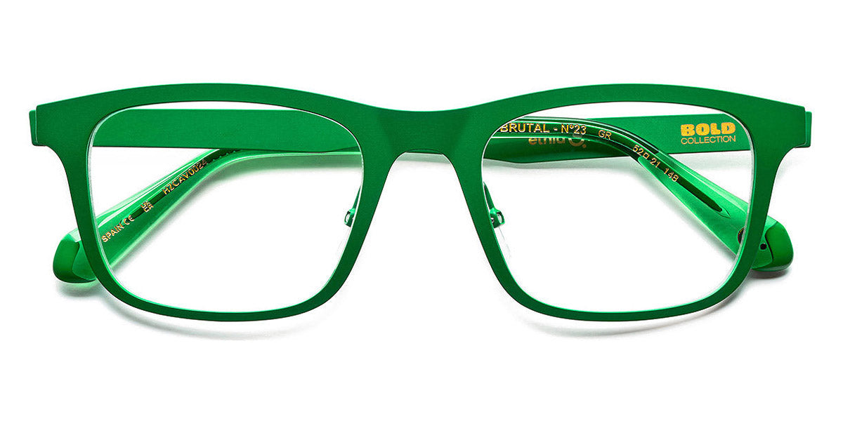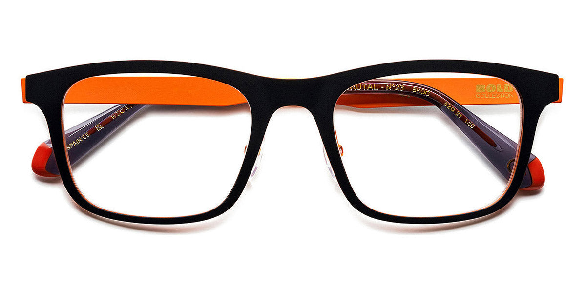 BRUTAL NO.23 Eyeglasses by Etnia Barcelona. Color: BKOG Black/Orange, BL Blue, GR Green, Size: 52-21-148. The BRUTAL No.23 frames bring a classic wayfarer aesthetic softened with rounded edges and spruced up with vibrant colors. Built with precision from high-quality acetate, they offer durability, versatility, and comfort that lasts all day. The sparkling lucid finish and whimsically designed temples add a touch of lighthearted charm to the timeless silhouette. Whether you go with the classic black or the juicy green, this model is sure to bring out your fun side.