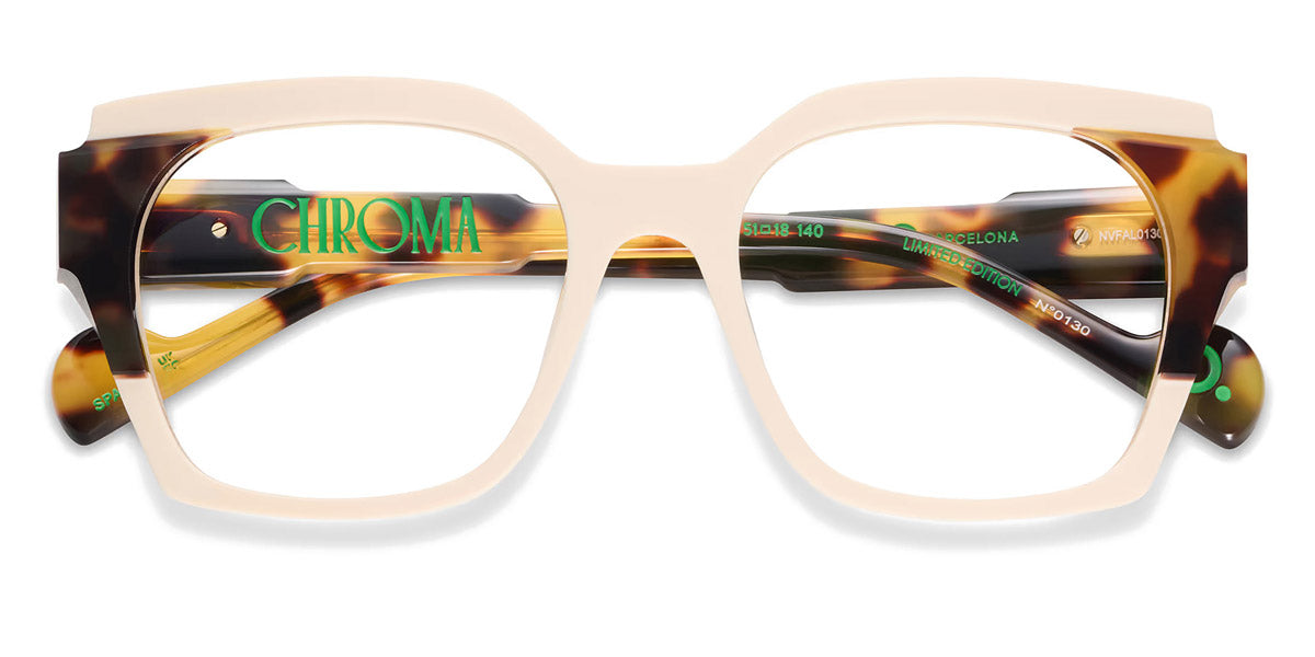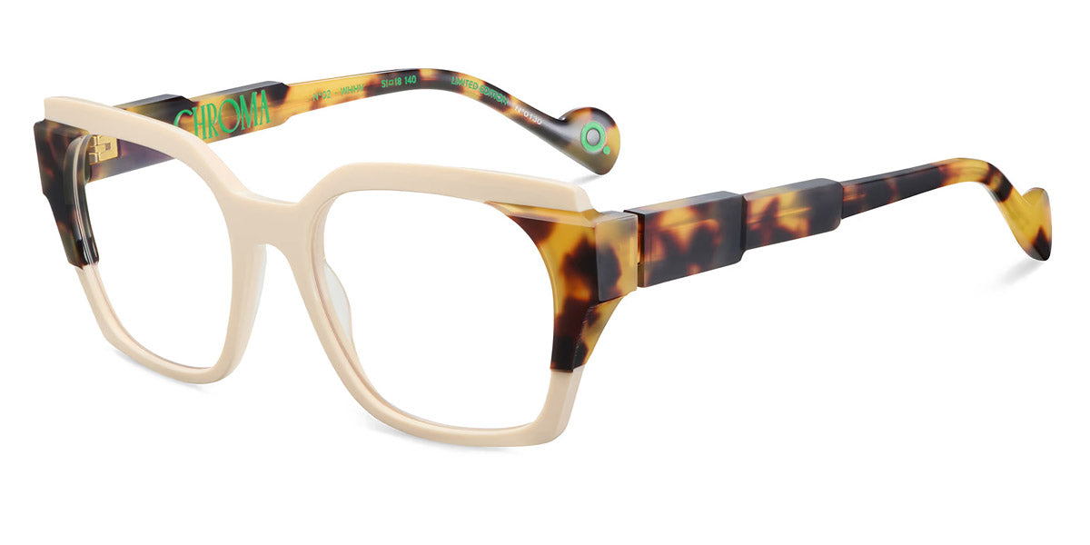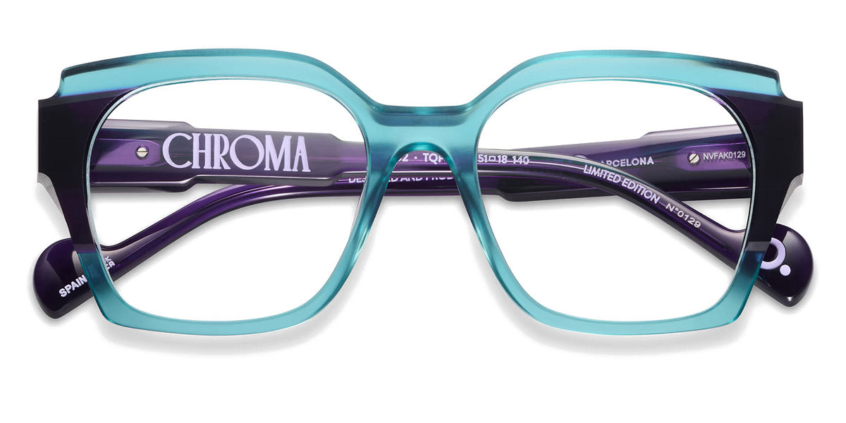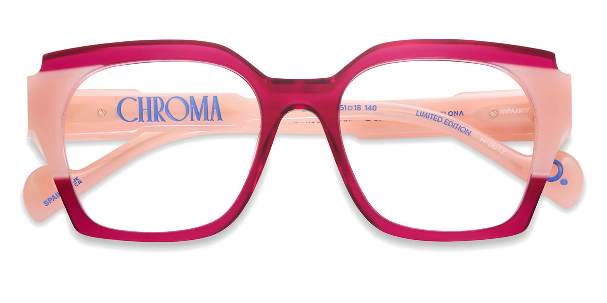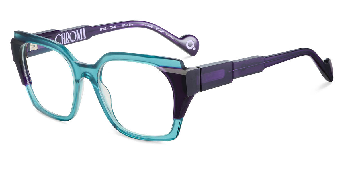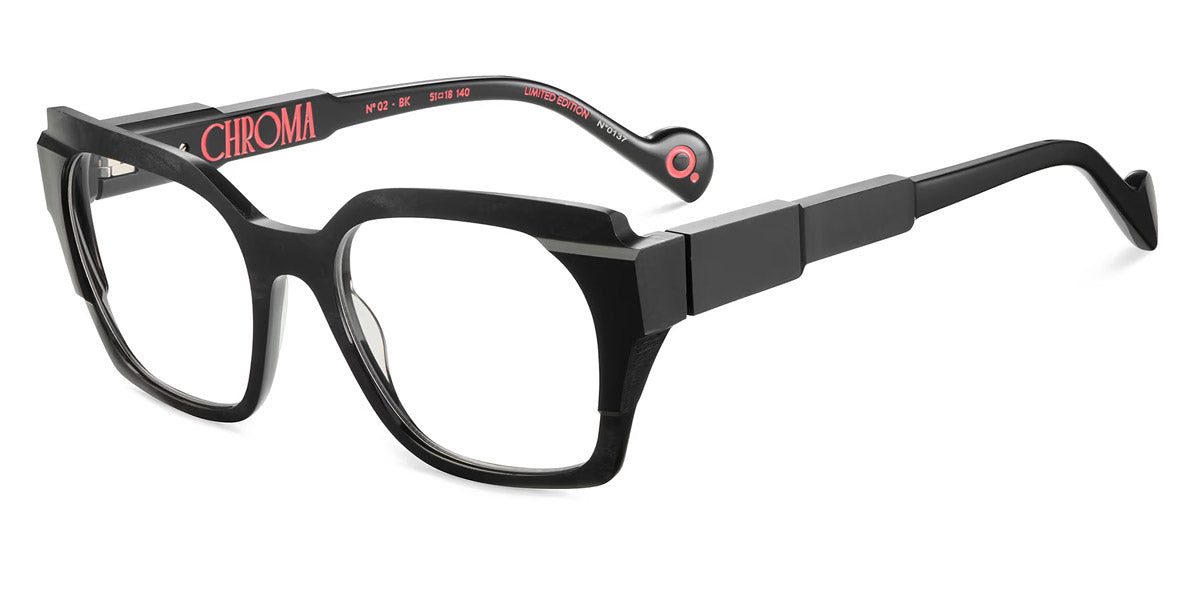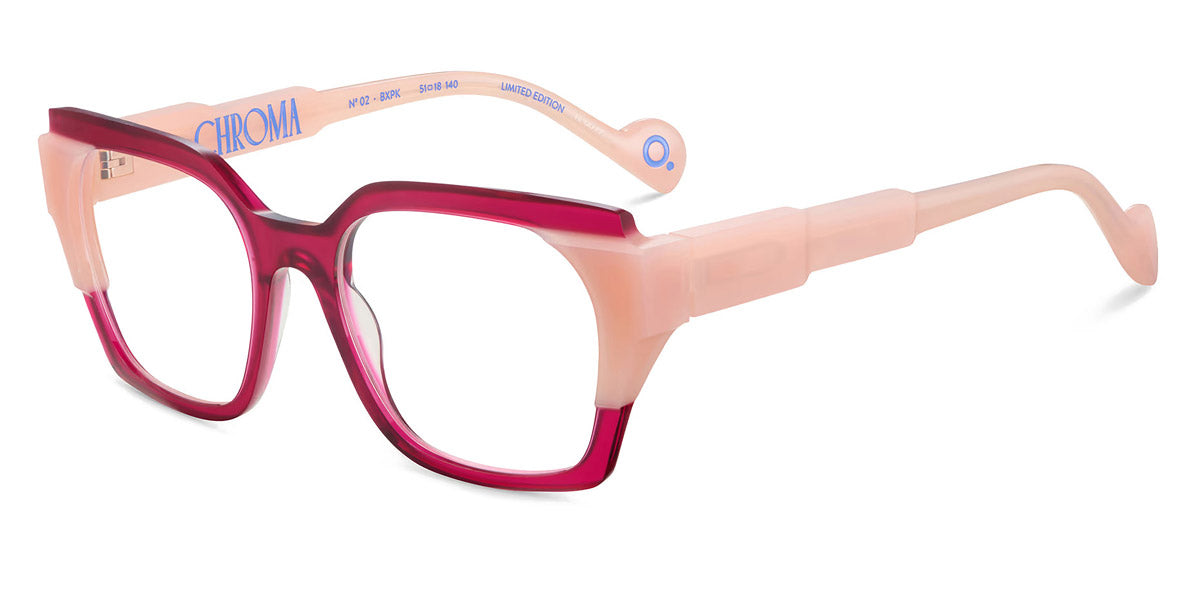 CHROMA N02 Eyeglasses by Etnia Barcelona. Color: BK Black, BXPK Red/Pink, TQPU Blue/Purple, WHHV White/Havana, Size: 51-18-140. Daring and modern, the CHROMA N02 features a geometric square shape with a bold, sculptural design. Crafted from premium acetate, the frame is lightweight yet resilient, offering both style and comfort. The vibrant hues and filigree branding add sophistication, with the deep hues enhancing the frame’s sharp lines. Perfect for those who appreciate strong, contemporary aesthetics, the CHROMA N02 brings structure and elegance to your everyday look.