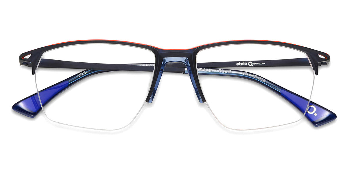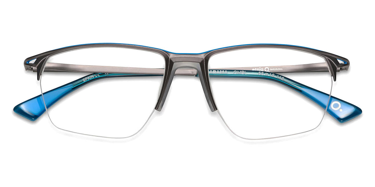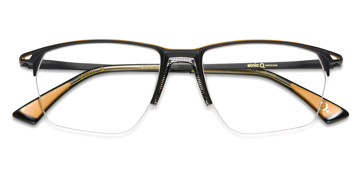 JARAMA Eyeglasses by Etnia Barcelona. Color: BKYW Black/Yellow, BLOG Blue/Orange, GMBL Gunmetal/Blue, GR Green, Size: 55-18-148. Designed with motion in mind, the JARAMA eyeglasses feature a sleek, aerodynamic rectangular frame. The semi-rim design leans into sporty elegance, making them perfect for active, stylish wearers. Temple tips with bright accents bring a lively energy to the streamlined appearance. The construction is lightweight and comfortable for extended wear, yet durable, ideal for on-the-go lifestyles. Slip these on and rediscover what the ultimate combo of comfort and flair looks like.