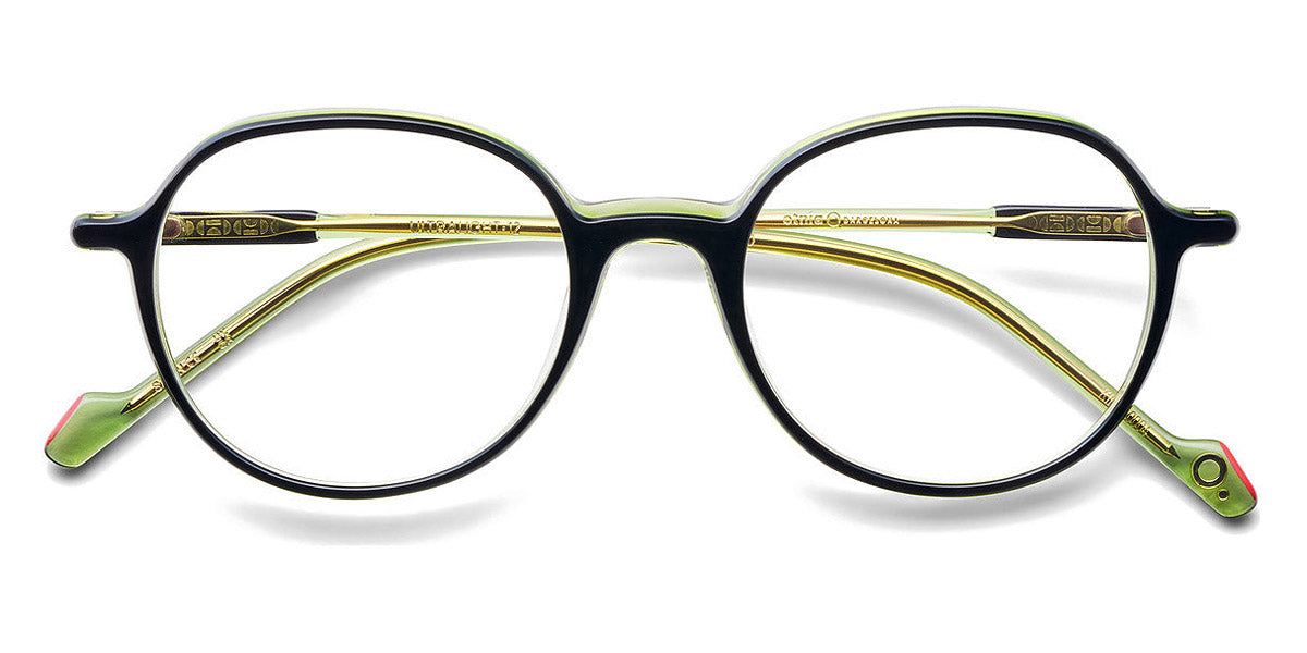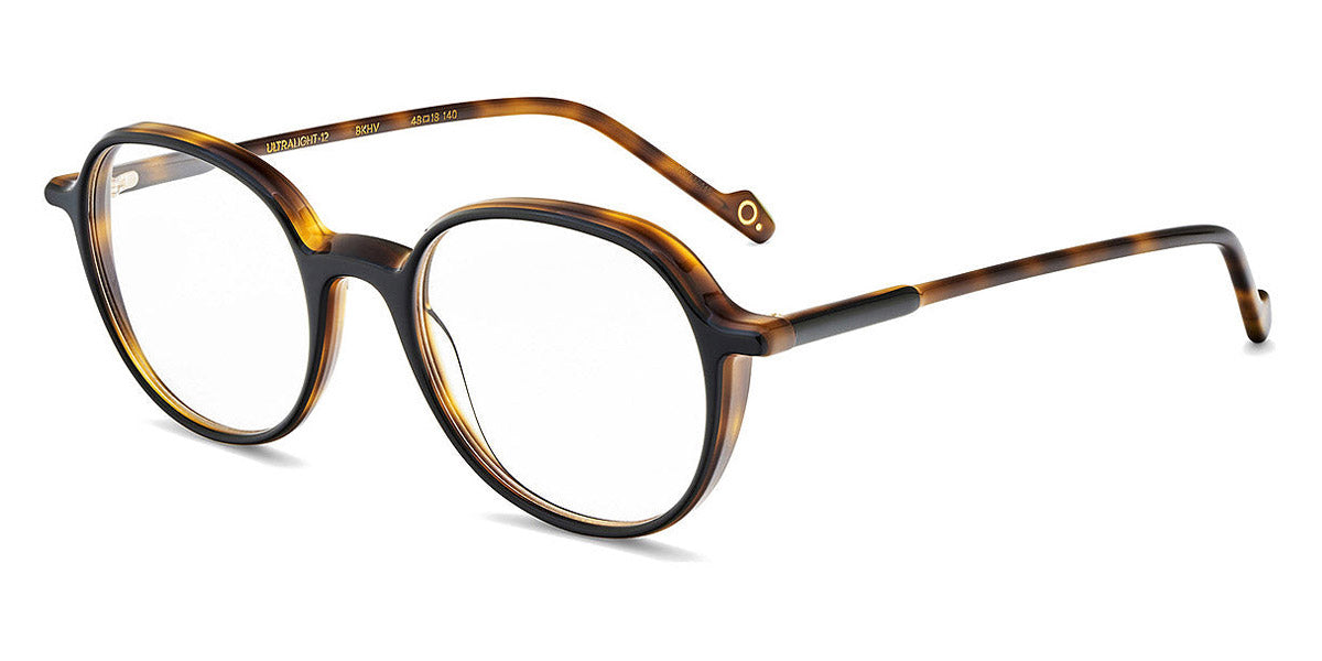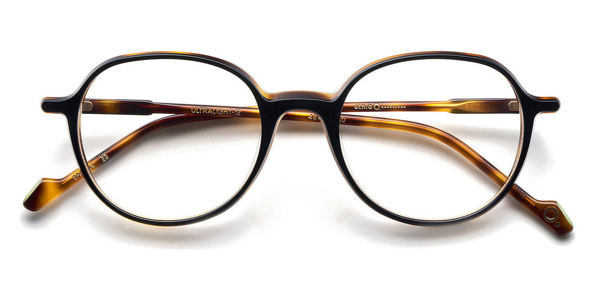 ULTRA LIGHT 12 Eyeglasses by Etnia Barcelona. Color: BKGR Black/Green, BKHV Black/Havana, BROG Brown/Orange, COSK Pink/Blue, Size: 48-18-140. Charming and airy, the ULTRA LIGHT 12 frames offer a stylish panto shape with color contrasts that catch the eye. The super-slim acetate provides a lightweight feel, while the sculptural temple tips add a unique touch. Equipped with cutting-edge Barberini lenses, these glasses provide crystal-clear sharpness and anti-scratch durability. Add a dash of playful sophistication to your everyday eyewear and enjoy unmatched comfort with the ULTRA LIGHT 12.