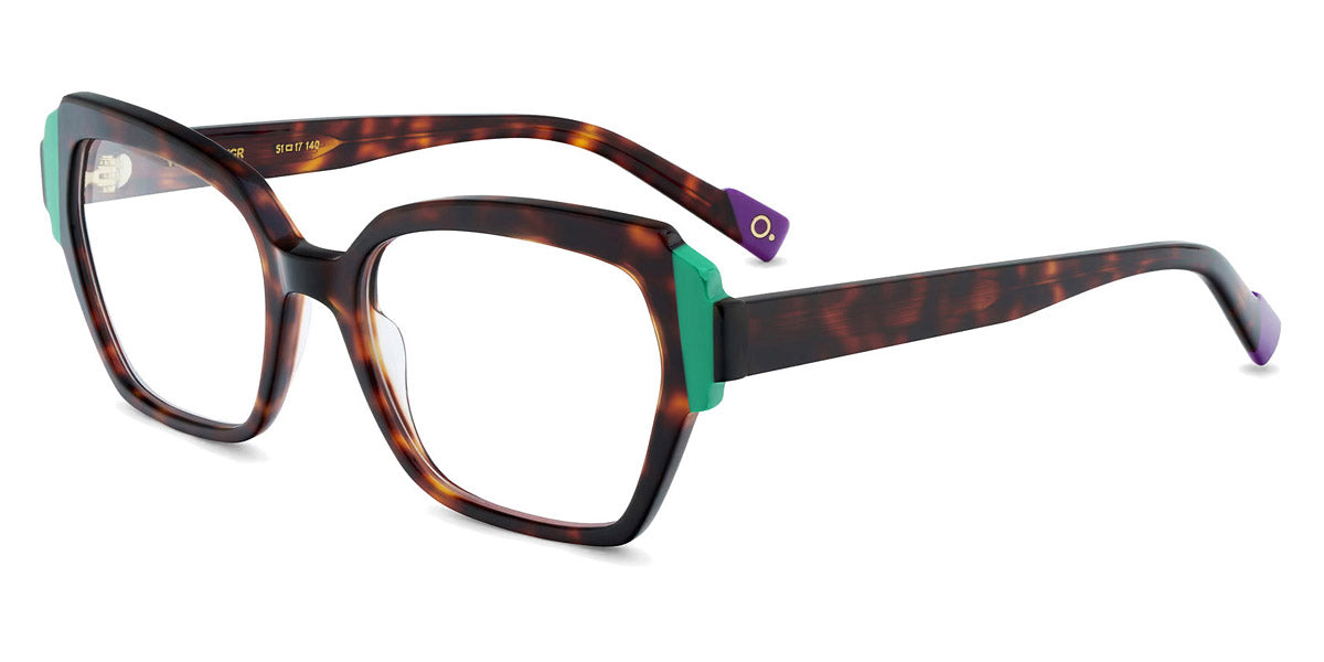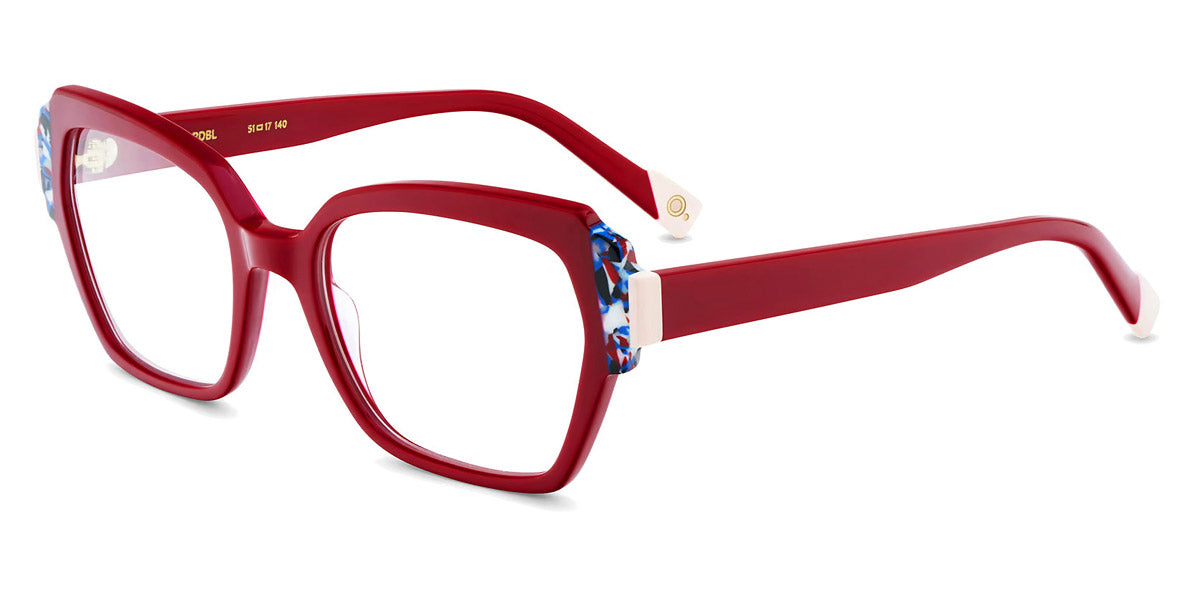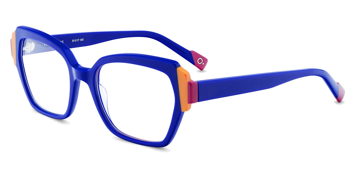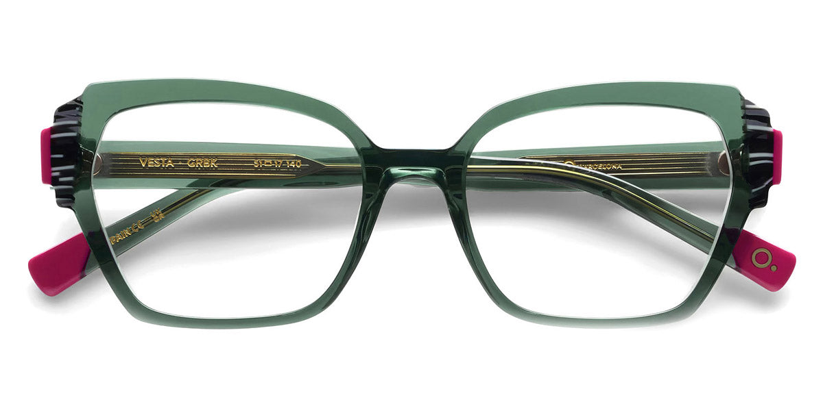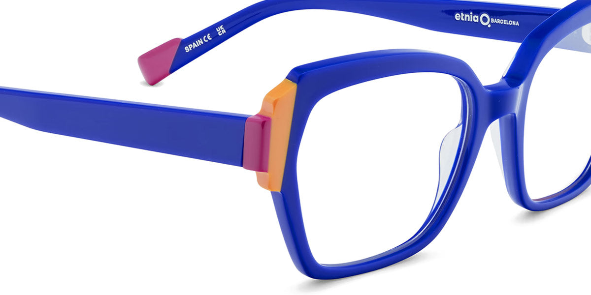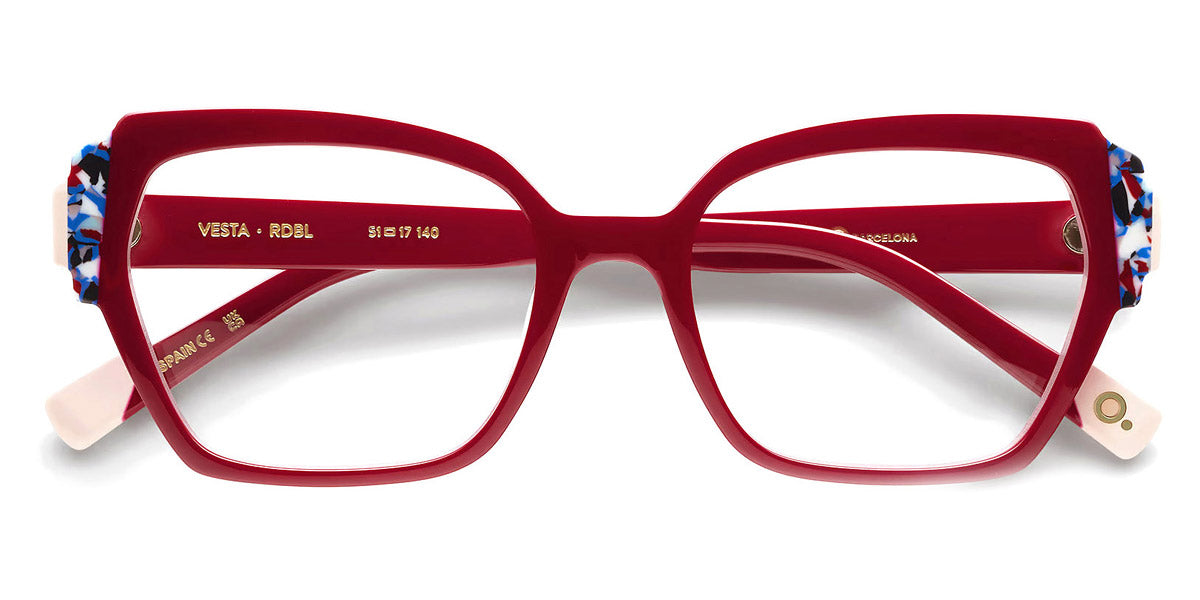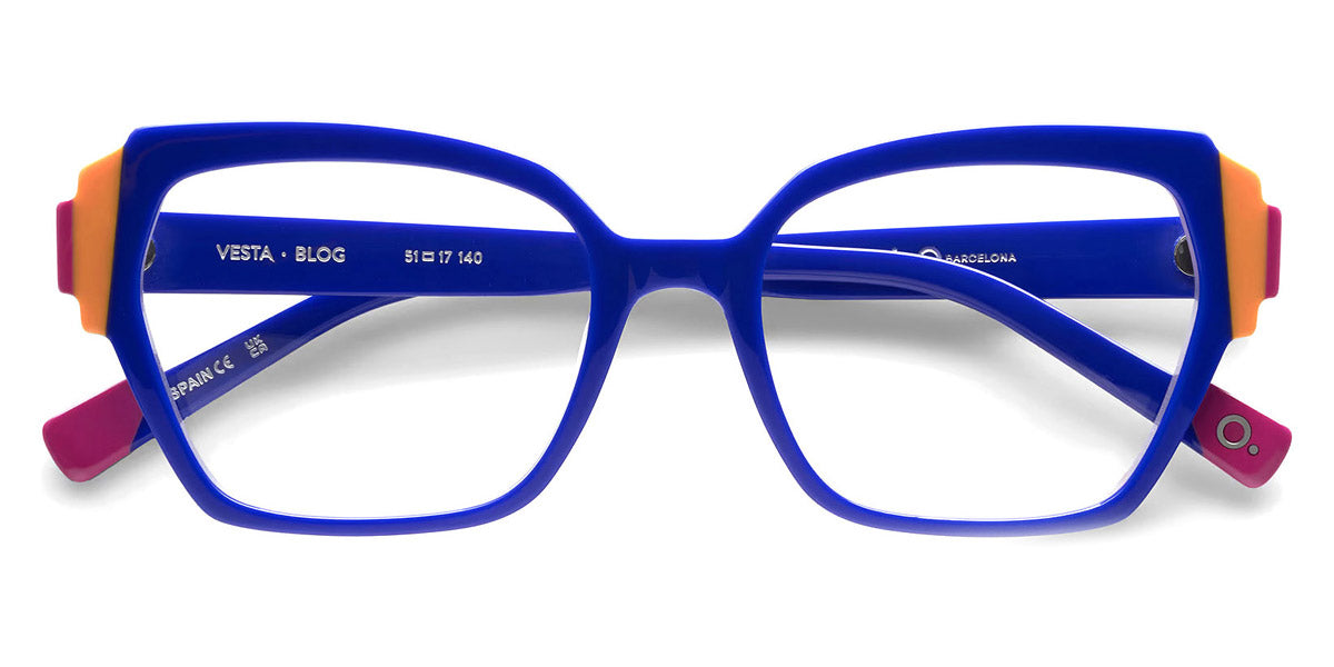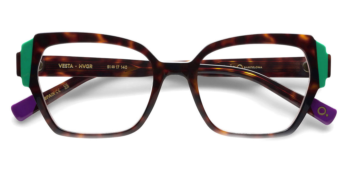VESTA Eyeglasses by Etnia Barcelona. Color: BLOG Blue/Orange, GRBK Green/Black, HVGR Havana/Green, RDBL Red/Blue, Size: 51-17-140. The VESTA eyeglasses add a dash of drama to any look with their daring butterfly silhouette and chunky temple architecture. The use of premium Mazzucchelli acetate enhances their striking presence, while a range of vibrant palettes adds a playful edge to the design. Weighing almost nothing yet capable of withstanding significant pressure and impact, they ensure all-day comfort and a secure fit. Embrace the bold dimensional artistry of the VESTA and let your eyewear style do the talking.