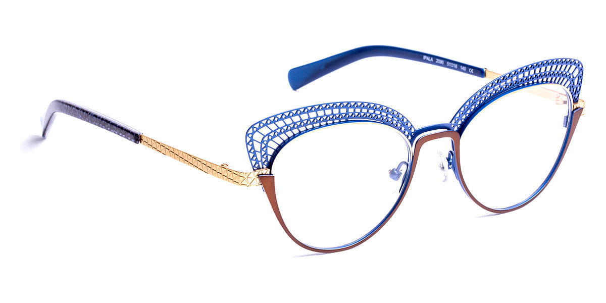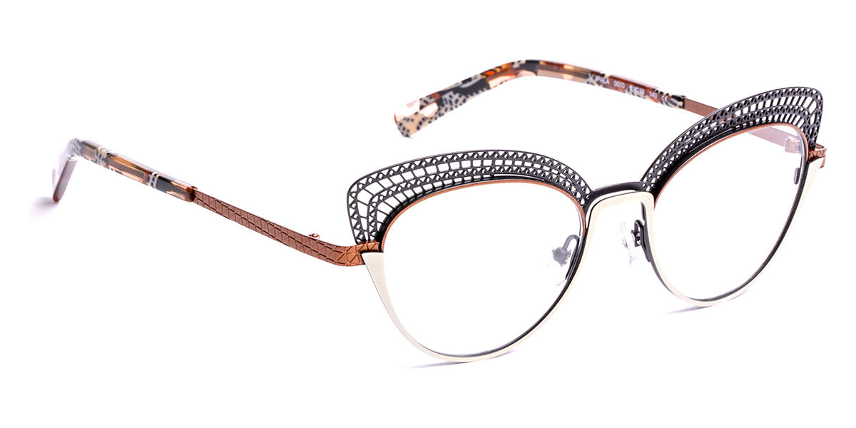 Ipala Eyeglasses by J.F. Rey. Color: 0010 Ivory/Black/Brown, 2090 Brown/Blue/Gold, Size: 51-18-140. The Ipala eyeglasses designed by J. F. Rey, which showcase an exquisite cat-eye shape design, harmonizing a full-rim acetate and metal frame. Available in two different color combinations and sizes, the Ipala model offers a range of options. The metal frame is accompanied by long acetate sleeves, and this model stands out with an openwork pattern on its top. Its distinctive visual identity is accentuated by the shape and patterns present on the eyebrows. The volumes and varied lines of this model are elevated through a lavish chromatic treatment. The French brand J. F. Rey masterfully melds opposing qualities, resulting in a look of seamless perfection. Their eyeglasses seamlessly embody elements of conservatism, audacity, and vibrancy, all while retaining a sense of unpretentious charm. Wearing these frames requires a touch of charisma and inner strength, as the brand's uniqueness is unparalleled and irreplaceable. In the crafting of their eyeglasses, only materials with a proven history of excellence are utilized.