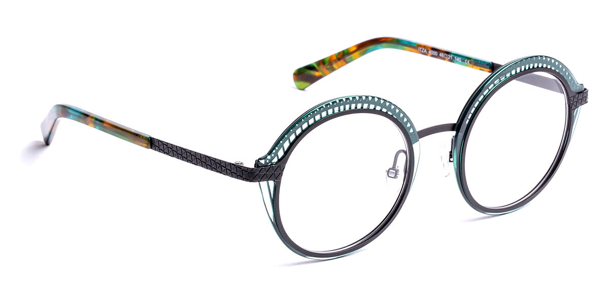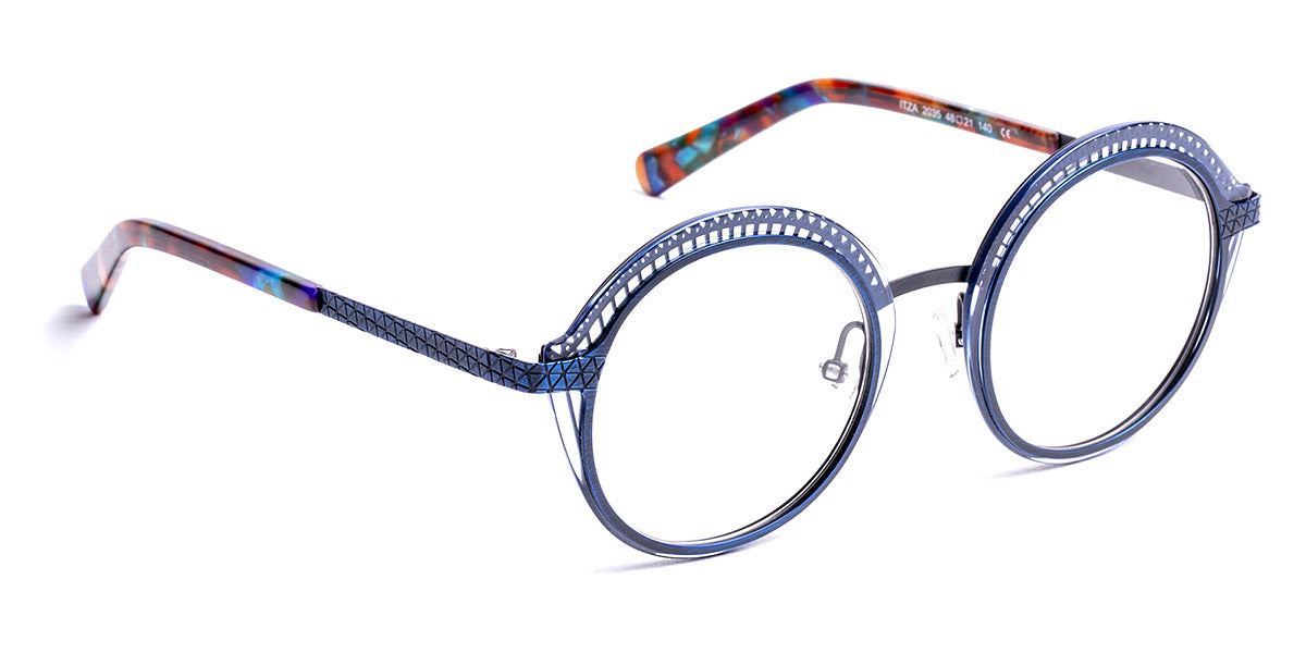 Itza Eyeglasses by J.F. Rey. Color: 2035 Blue/Brushed Blue, 4000 Green/Black, Size: 48-21-140. The captivating Itza eyeglasses by J. F. Rey designed for women, where innovation and aesthetics converge to create a visual masterpiece. The round shape design takes center stage, adorned with a full-rim acetate and metal frame that effortlessly marries form and function. This model is more than just eyewear; it's an expression of individuality. With two distinct color combinations and sizes available, the Itza eyeglasses cater to the diverse tastes of those seeking both style and substance. The allure of the Itza model lies in its intricate craftsmanship, a fusion of lightweight metal and acetate that harmonize to create a frame of unparalleled grace. A symphony of stainless steel layers cradles a delicate sheet of acetate at the heart of the frame's front, resulting in a marriage of materials that reflects the brand's commitment to innovation. This design's uniqueness is further elevated by its acetate transparency, a window to the stainless openwork pattern gracefully etched onto the back of the frame. As you wear the Itza eyeglasses, you are not only embracing an accessory but an artwork that radiates sophistication from every angle. J. F. Rey, a revered French brand, skillfully weaves together contrasting characteristics to produce eyeglasses that redefine elegance. Conservative yet daring, flashy yet unpretentious, each creation stands as a testament to the brand's artistry. These eyeglasses are far more than adornments; they are a testament to individuality and poise. But to truly unlock their charm, you must possess a certain charisma and inner strength – qualities that bring these frames to life and complete their narrative.