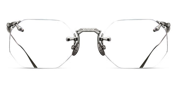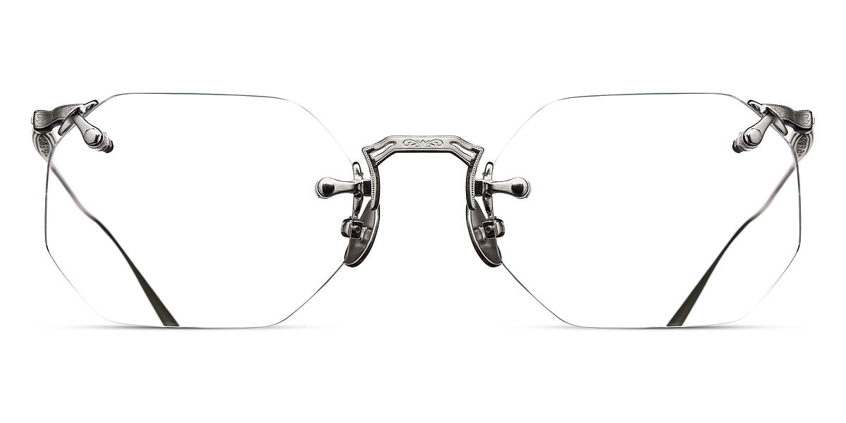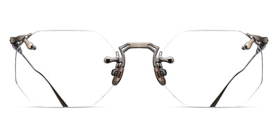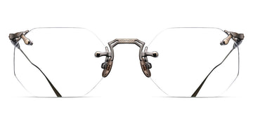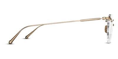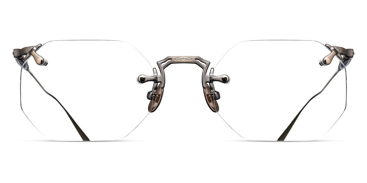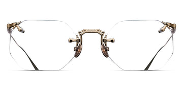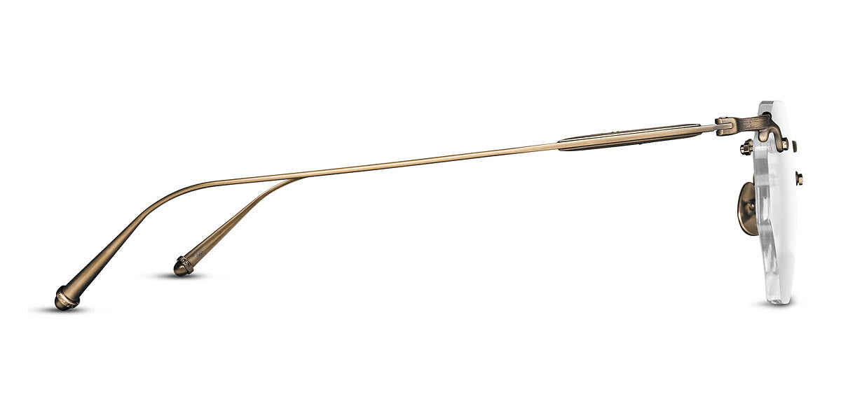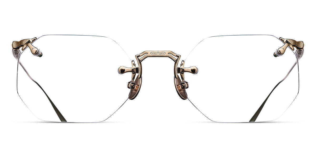 M3104-B Eyeglasses by Matsuda. Color: Antique Gold, Brushed Gold, Palladium White, Size: 49-22-145. Treat yourself to pure luxury with the M3104-B. It boasts a classic hexagonal drill mount design crafted from ultra-lightweight titanium. Inspired by rimless designs invented in the 1800s, this masterpiece offers unbeatable comfort. But the brand's modern interpretation is distinguished by hand-engraved details at the top and bottom of the flexible beta-titanium temples, setting it apart from other frames. Handcrafted in Japan, this rimless frame features lightweight titanium construction, beta titanium temples and unique engravings, making it a choice for those with a penchant for elegant eyewear.