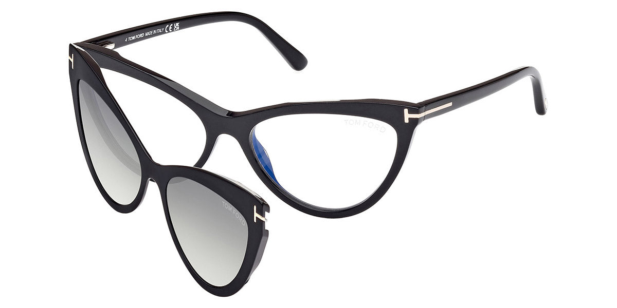 FT5896-B Eyeglasses with Clip-on by Tom Ford. Color: Classic Dark Havana / Shiny Rose Gold / t" Logo / Blue Block Lenses, Shiny Black / Shiny Rose Gold / t" Logo / Blue Block Lenses. Size: 56-16-140.