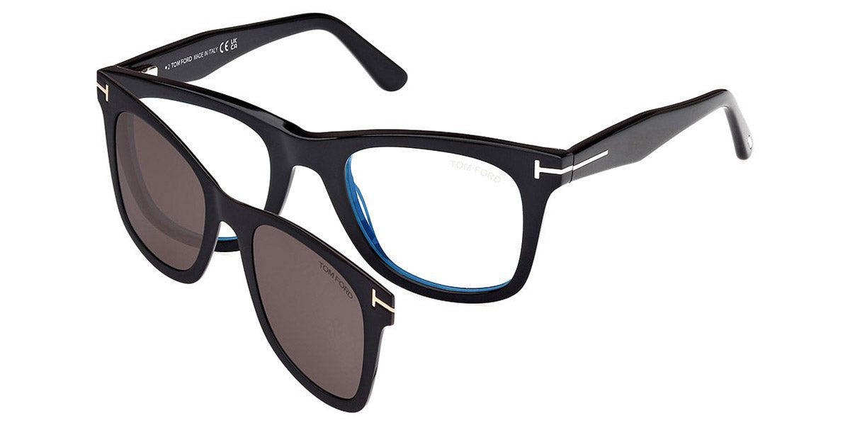 FT5970-B Eyeglasses with Clip-on by Tom Ford. Color: 001 - Shiny Black / Shiny Black, 052 - Dark Havana / Dark Havana, 005/Black/Havana / Black/Havana. Size: 50-21-145.