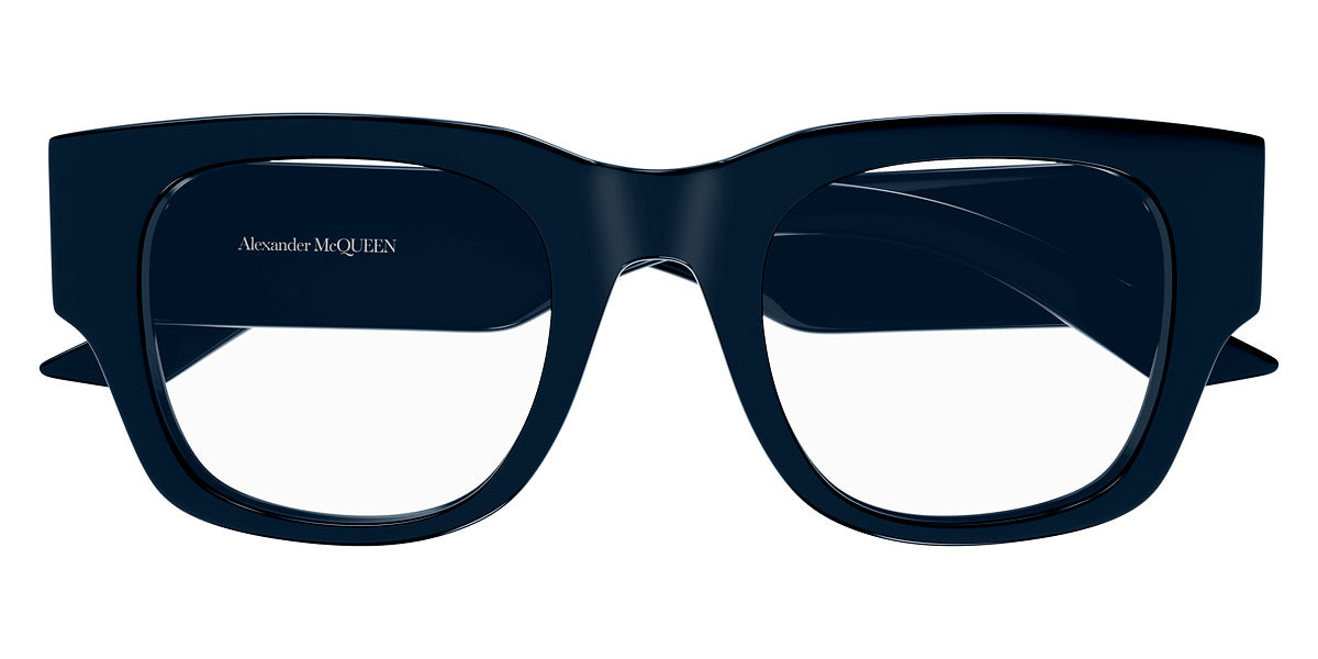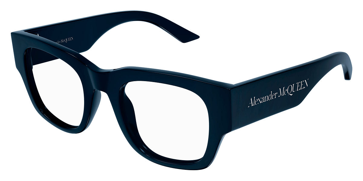 AM0455O Eyeglasses by Alexander McQueen. Color: Blue, Size: 50-22-145. The Alexander McQueen eyewear pieces are must haves for anyone who wants to stand out from the crowd, yet without being exorbitant and retaining a certain air of refinement. Each pair of sunglasses and optical frames is embellished with luxury details, such as skulls, studs and bugs that make the difference on every outfit, succeeding even to upgrade the simplest looks. Masterfully crafted in Italy from the highest grade materials, the McQueen’s glasses meet the needs of the most demandable clients. Lady Gaga, Michelle Obama and Cate Blanchett are among the brand’s most loyal fans. All Alexander McQueen Eyewear is 100% certified UV protective (UVA and UVB rays).