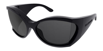 BB0154S Sunglasses by Balenciaga. Shape: Butterfly, Material: Acetate, Color: Black / Gray, Size: 72-18-115. The Balenciaga Eyewear collections consist of sunglasses and eyeglasses frames that combine a simple new style with the fashion house's desire to be inspired by technological innovation in its shapes and silhouettes. They embody revolutionary trends and fashionable realism. All models of glasses are marked with the brand's corporate logo, interpreted in their own way in different styles. The black double monogram "B" is set on transparent nose pads, creating a floating and weightless effect. The logo of the brand's sunglasses is applied to the mirror coating, which in different variations is always presented on the left temple. Extraordinary designs and unconventional materials mixed with more classic ones make Balenciaga eyewear unique and easily recognizable.