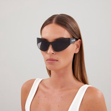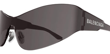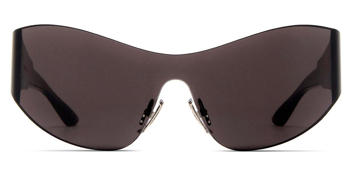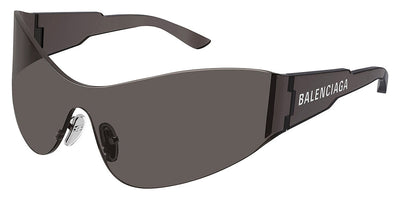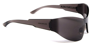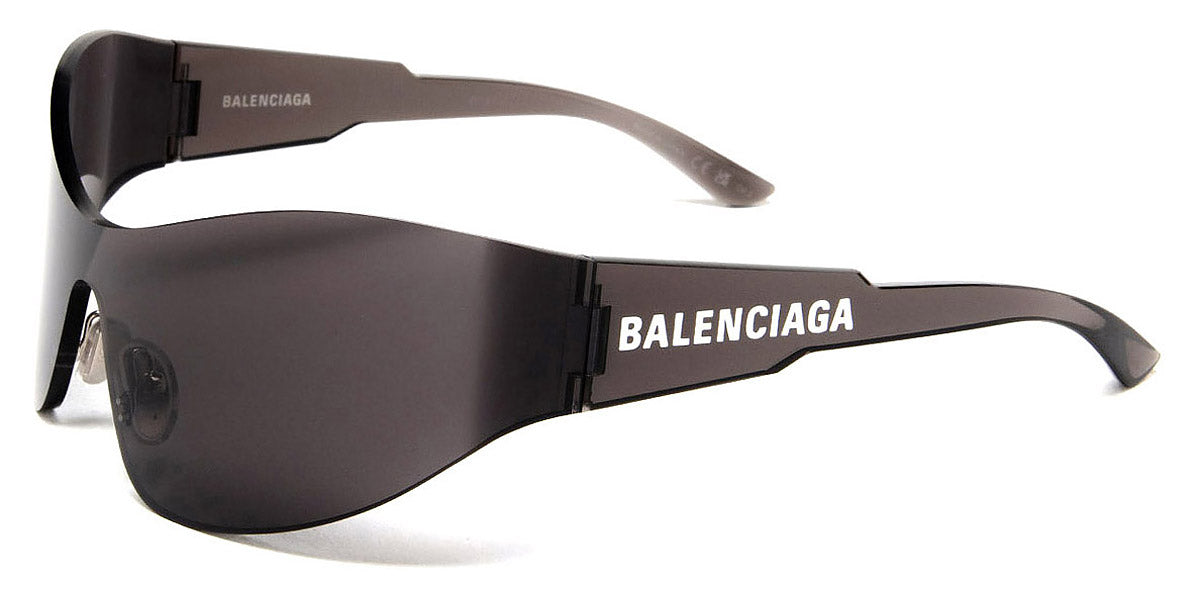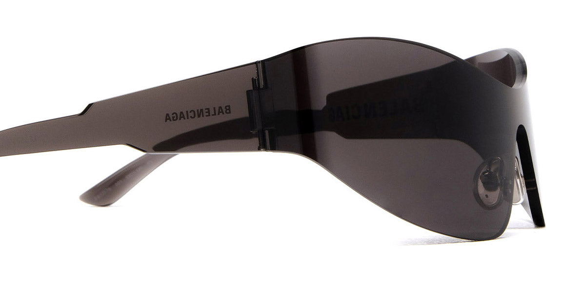 BB0257S Sunglasses by Balenciaga. Shape: Wrap, Material: Nylon, Color: Gray, Size: 99-1-125. The Balenciaga Eyewear collections consist of sunglasses and eyeglasses frames that combine a simple new style with the fashion house's desire to be inspired by technological innovation in its shapes and silhouettes. They embody revolutionary trends and fashionable realism. All models of glasses are marked with the brand's corporate logo, interpreted in their own way in different styles. The black double monogram "B" is set on transparent nose pads, creating a floating and weightless effect. The logo of the brand's sunglasses is applied to the mirror coating, which in different variations is always presented on the left temple. Extraordinary designs and unconventional materials mixed with more classic ones make Balenciaga eyewear unique and easily recognizable.