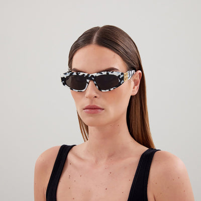 BB0095S Sunglasses by Balenciaga. Shape: Square, Material: Acetate, Color: Gold / Black / Gray, Size: 53-19-135. The Balenciaga Eyewear collections consist of sunglasses and eyeglasses frames that combine a simple new style with the fashion house's desire to be inspired by technological innovation in its shapes and silhouettes. They embody revolutionary trends and fashionable realism. All models of glasses are marked with the brand's corporate logo, interpreted in their own way in different styles. The black double monogram "B" is set on transparent nose pads, creating a floating and weightless effect. The logo of the brand's sunglasses is applied to the mirror coating, which in different variations is always presented on the left temple. Extraordinary designs and unconventional materials mixed with more classic ones make Balenciaga eyewear unique and easily recognizable.