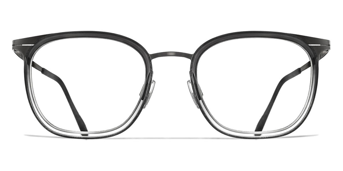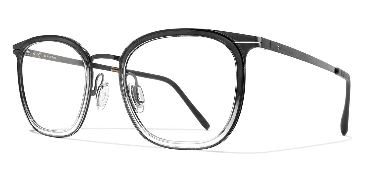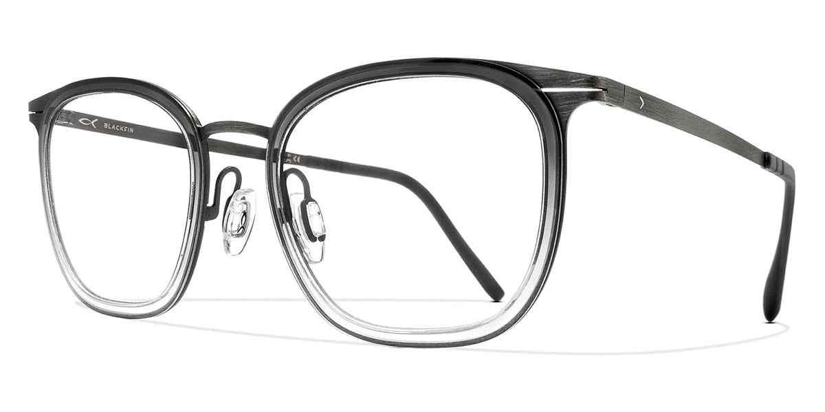 MCDOWELL Eyeglasses by Blackfin. Color: Black Gold/Gradient Smoke, Brushed Gunmetal/Gradient Smoke, Dark Blue/Gradient Blue, Green/Gradient Green, Silver/Gradient Smoke, Size: 50-21-145. Elegance defines the MCDOWELL, where graceful wayfarers merge sophistication with cutting-edge design. Crafted from a single sheet of beta titanium and paired with transparent nylon rims, this model offers unparalleled comfort and flexibility. Hypoallergenic and ultralight, the frame ensures durability while adapting seamlessly to various face shapes. The handmade colors add a unique touch to this blend of style and function.