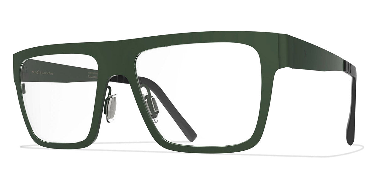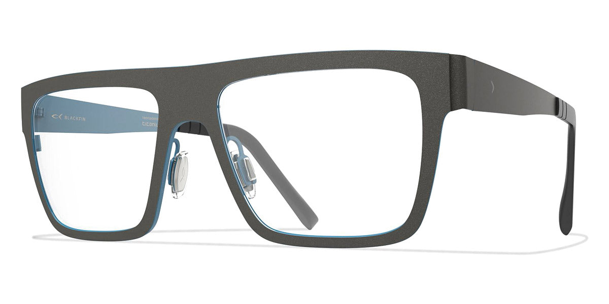WALDEN Eyeglasses by Blackfin. Color: Army Green, Gray/Blue, Black/Gray, Size: 54-18-145. Where minimalism meets innovation, the Blackfin WALDEN eyeglasses showcase a refined approach to contemporary eyewear. Their elongated rectangular shape is enhanced by smoothed-out corners, creating a frame that’s both structured and fluid. The sturdy construction ensures a featherlight feel, while the minimalist design allows the quality of materials to shine through. Available in a range of modern, muted tones, these glasses offer a sophisticated, polished look that’s as versatile as it is chic.